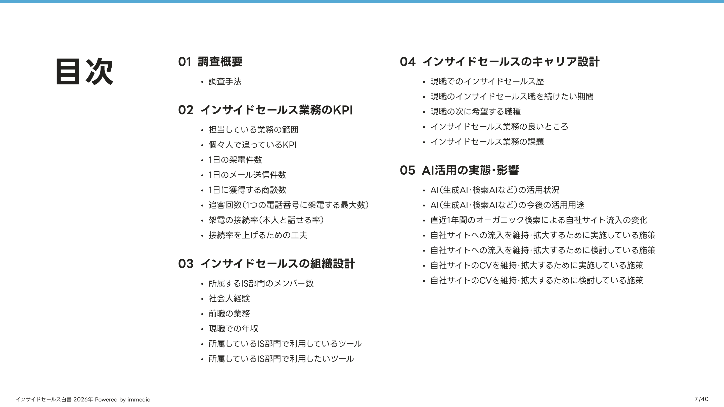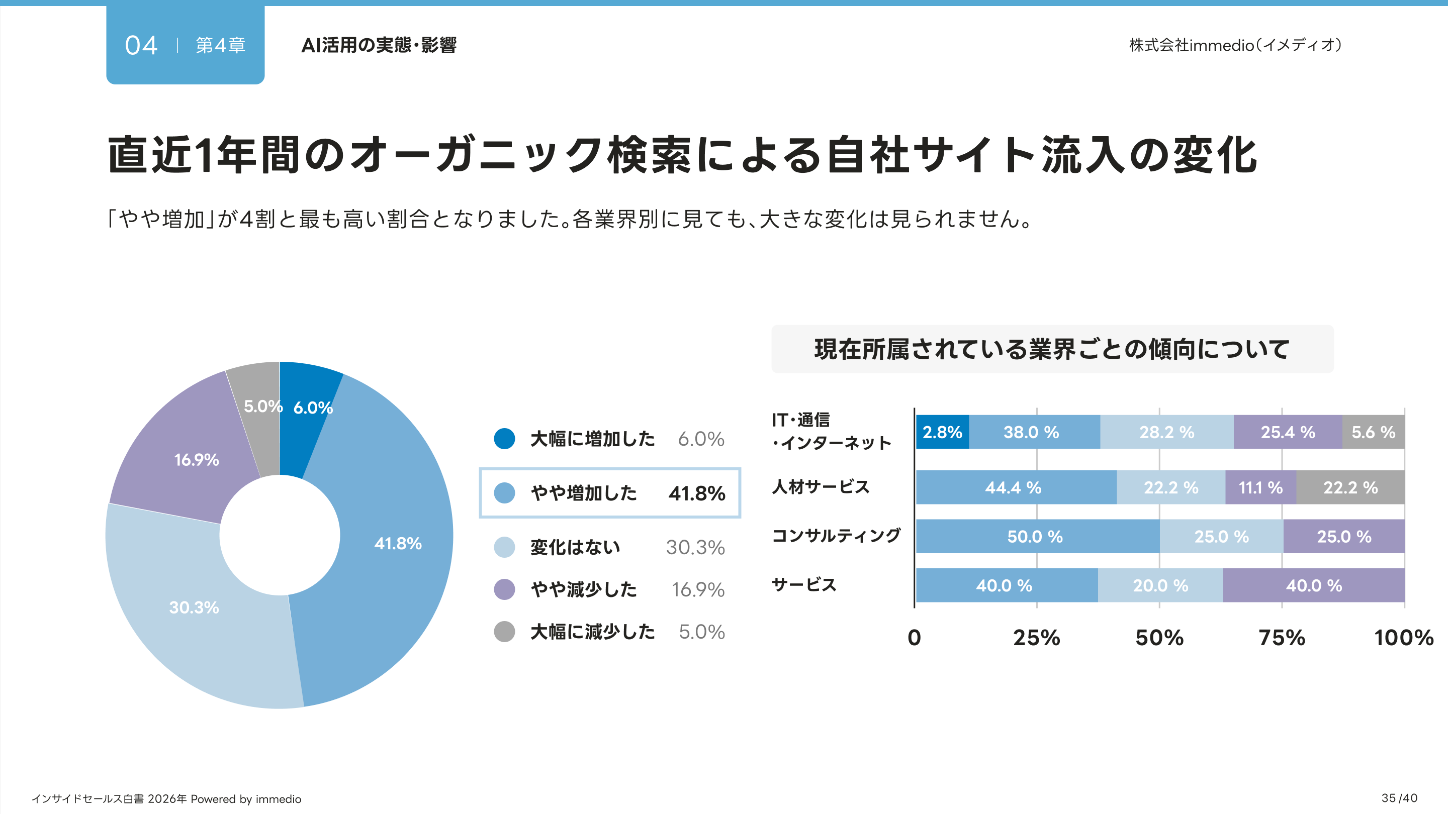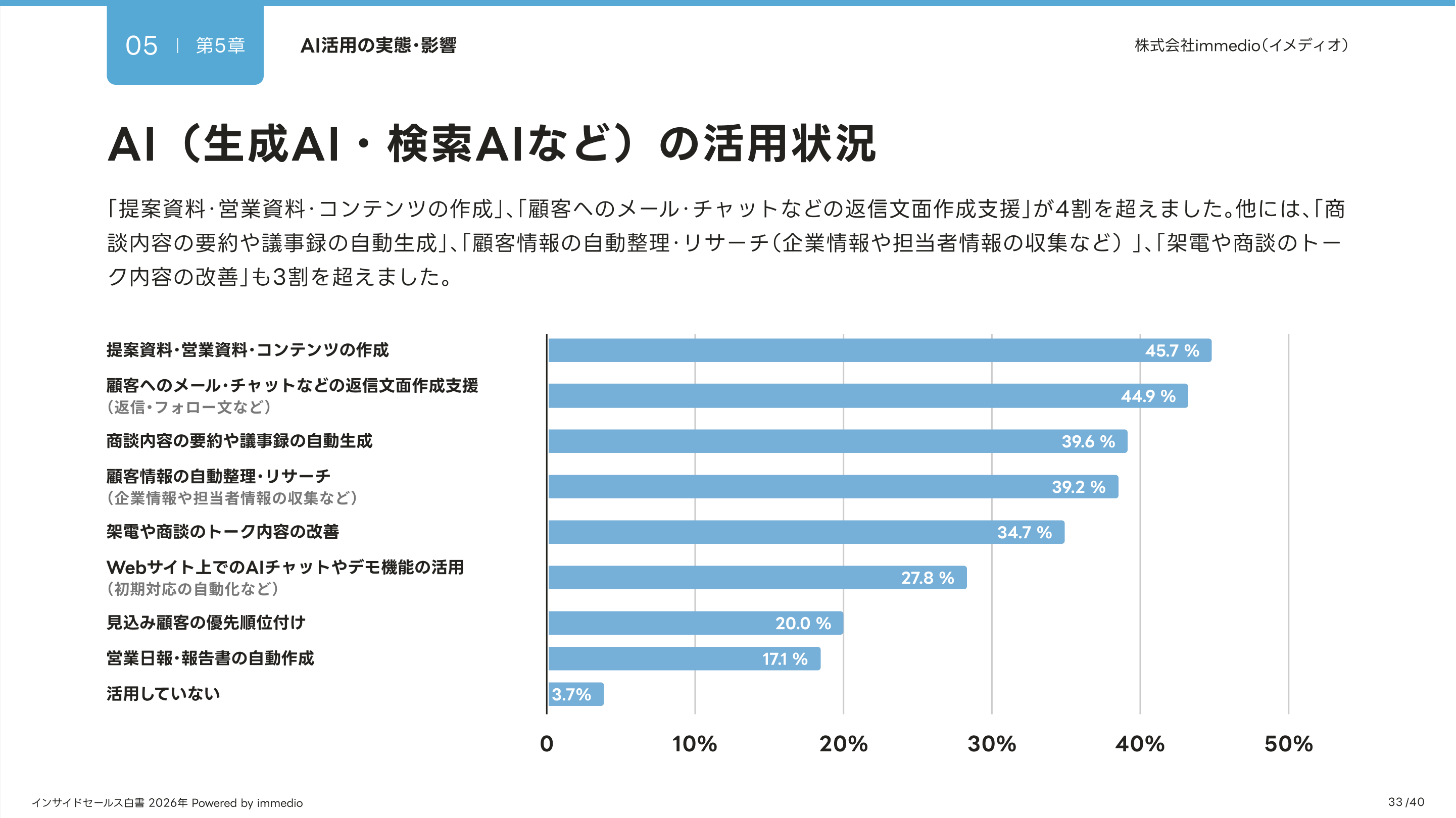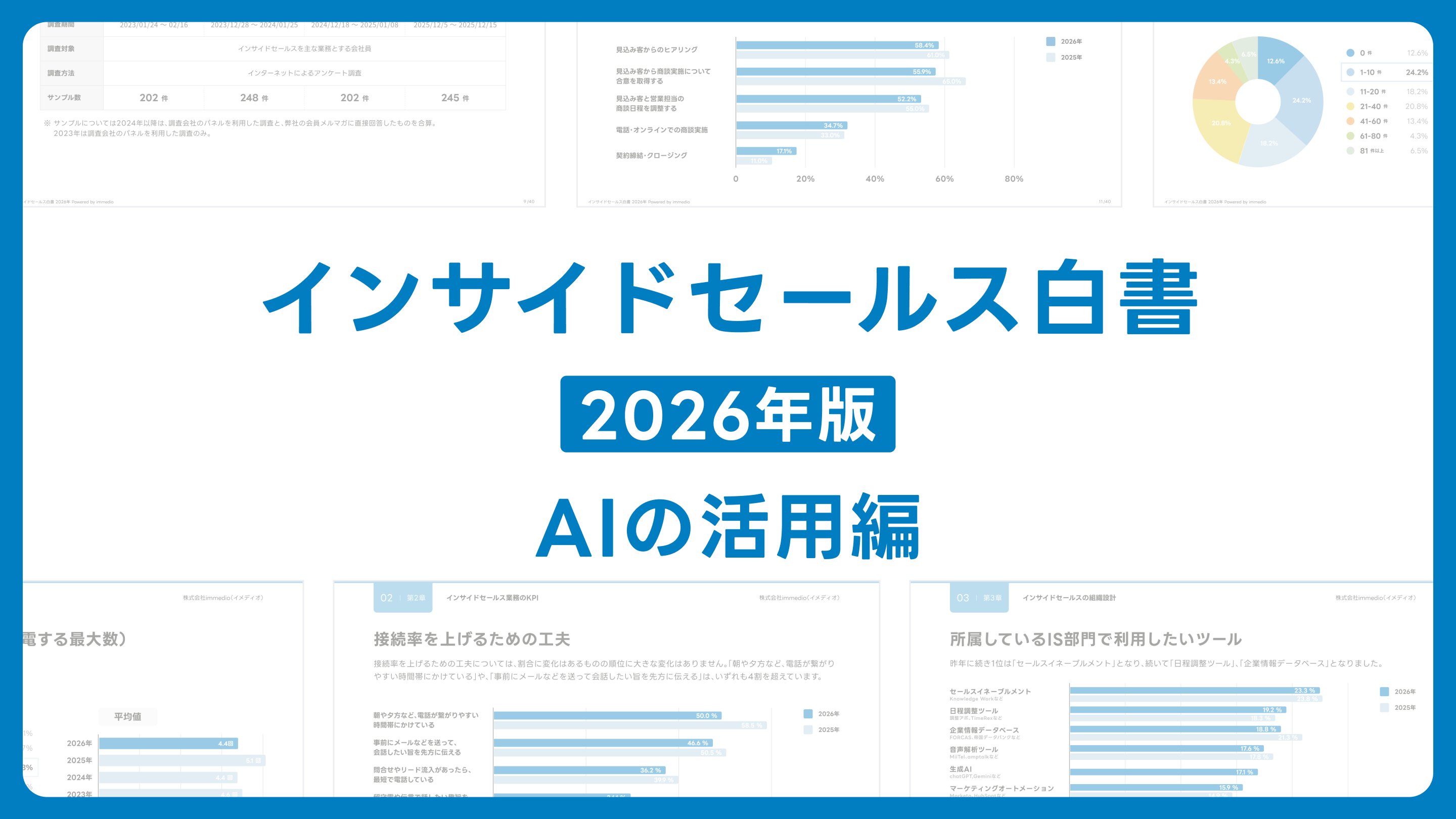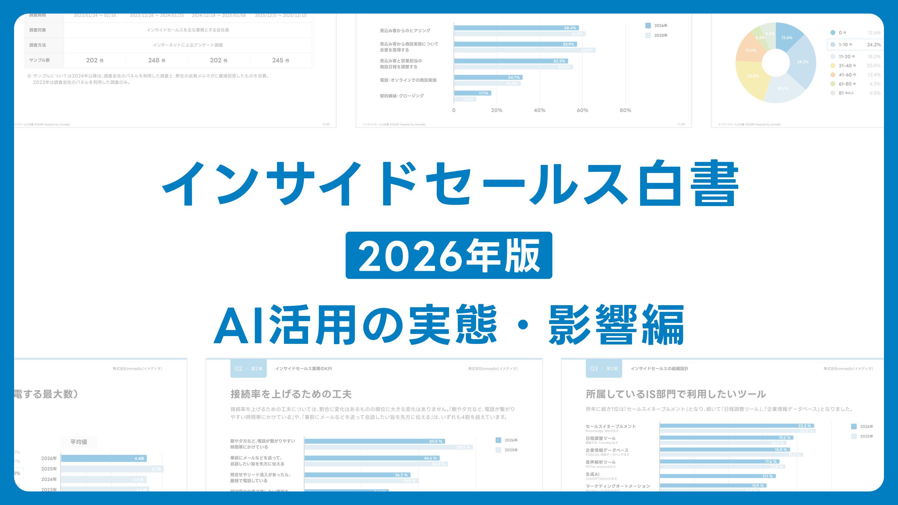 株式会社immedio(本社:東京都渋谷区、代表取締役:浜田英揮、以下immedio)が提供する“決まる商談が増える”AIインサイドセールス「immedio」(https://www.immedio.io/)が全国のインサイドセールス職245名を対象に、AIの活用状況に加え、AI活用を踏まえた自社サイトの流入・CVR改善に向けた取り組み状況について調査を実施し、その結果をまとめた「immedioインサイドセールス白書2026」を発刊いたしました。