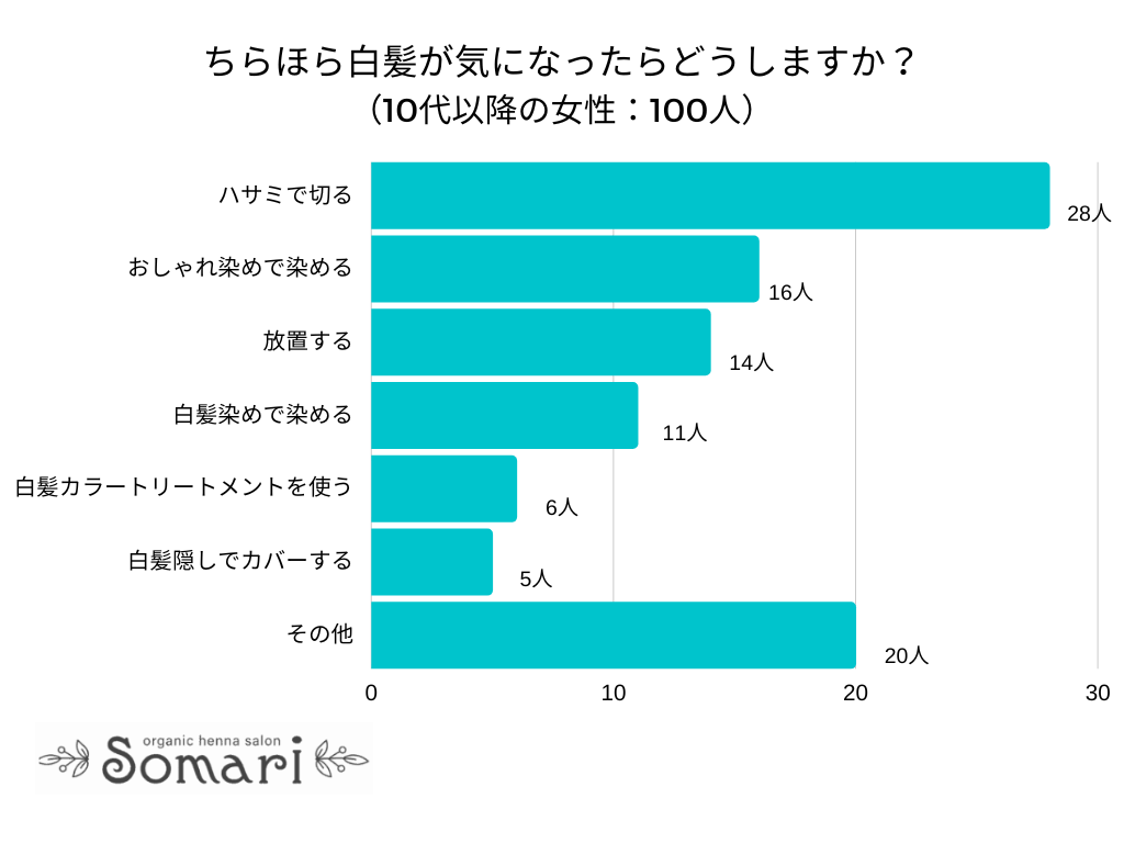 株式会社AWA(https://a-w-a.co.jp/)が運営する地域密着型白髪染め専門美容室ソマリ(https://a-w-a.co.jp/hennasalonsomari/)は、日本全国の10代以上の女性を対象に「ちらほら白髪が気になったらどうしますか?」とアンケート調査を実施しました。