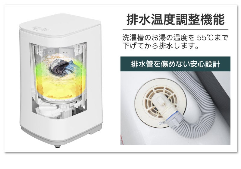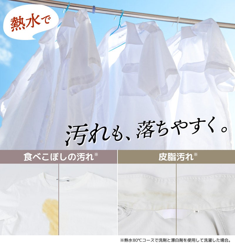 洗濯機内にヒーターを搭載、水を入れるだけで内部で温めてお湯で洗う仕組み。熱水80度、温水60度、温水40度(すすぎ2回/すすぎ3回)及び標準、おいそぎモードなど全8種類の洗濯コースを搭載。80度の熱水でしっかりと除菌(※1)する「熱水80度洗い」、皮脂汚れや臭いが気になるシャツなどの洗濯には60度の「温水60度洗い」、ベビー用などの洗濯には40度の「温水40度洗い」で熱水温水洗濯ができます。排水温度調整機能で排水時には排水管を傷めない温度の55度まで下げてから排水します。洗濯時に特別な洗剤は不要、いつもの洗剤が使えます。