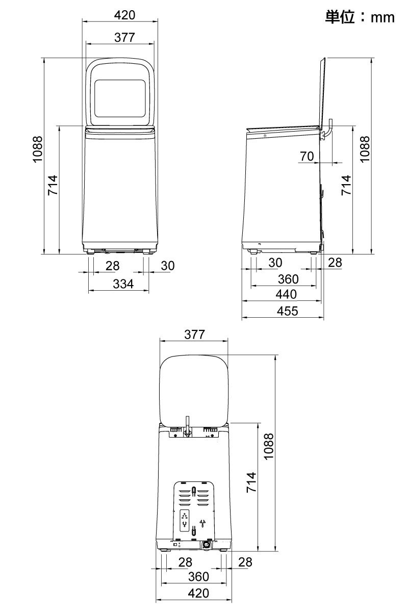 幅42×奥行45.5×高さ71.4cm。洗濯容量2.8kg(熱水モード時1.5kg)。