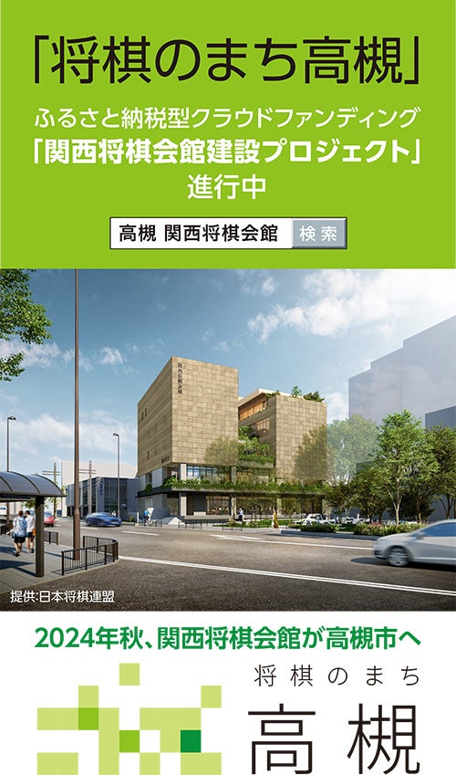 高槻市と日本将棋連盟が実施しているふるさと納税型クラウドファンディング。現在第3期を実施中。集まった寄附金はサイト手数料を除き、全額が関西将棋会館の建設に役立てられます。ご協力いただいた方には、藤井聡太七段(当時)のオリジナル局面扇子、記念直筆色紙など日本将棋連盟が用意する魅力あふれる記念品をお渡しします。