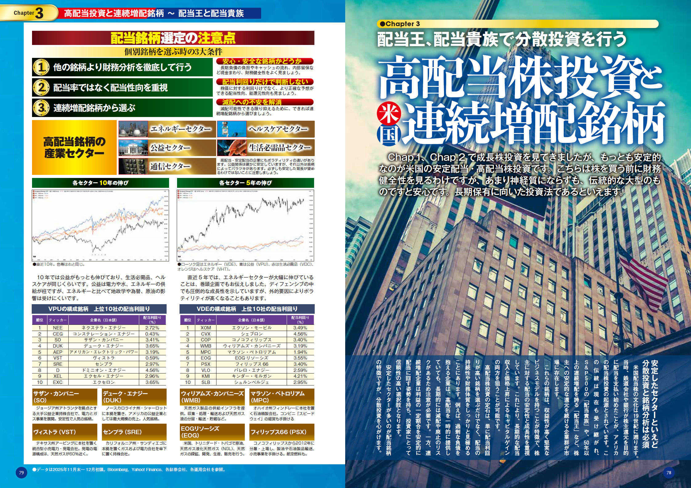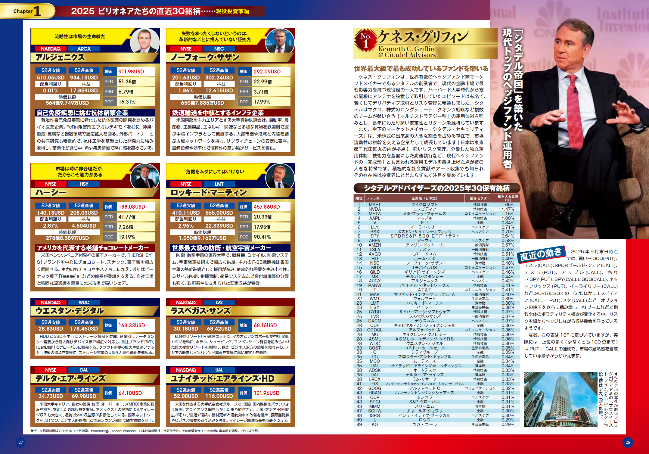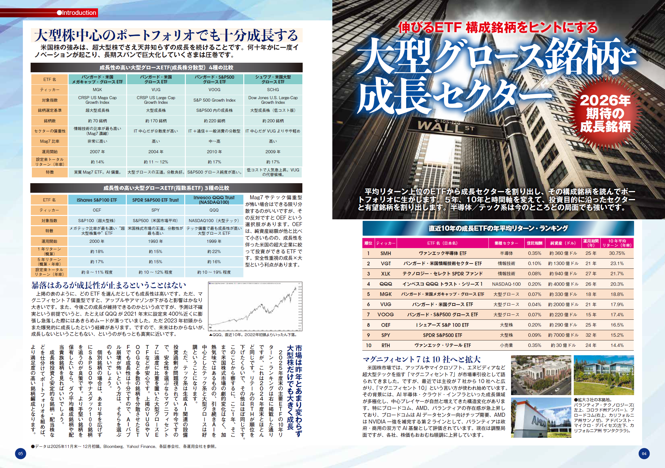 巻頭では2025年末から2026年の米国株全体の概観を見ます。セクター別の成長率や大型グロース、また5年、10年スパンの成長性を見ていきます。超有名企業から日本であまり知られていない銘柄まで、痒いところに手が届く構成となっています。