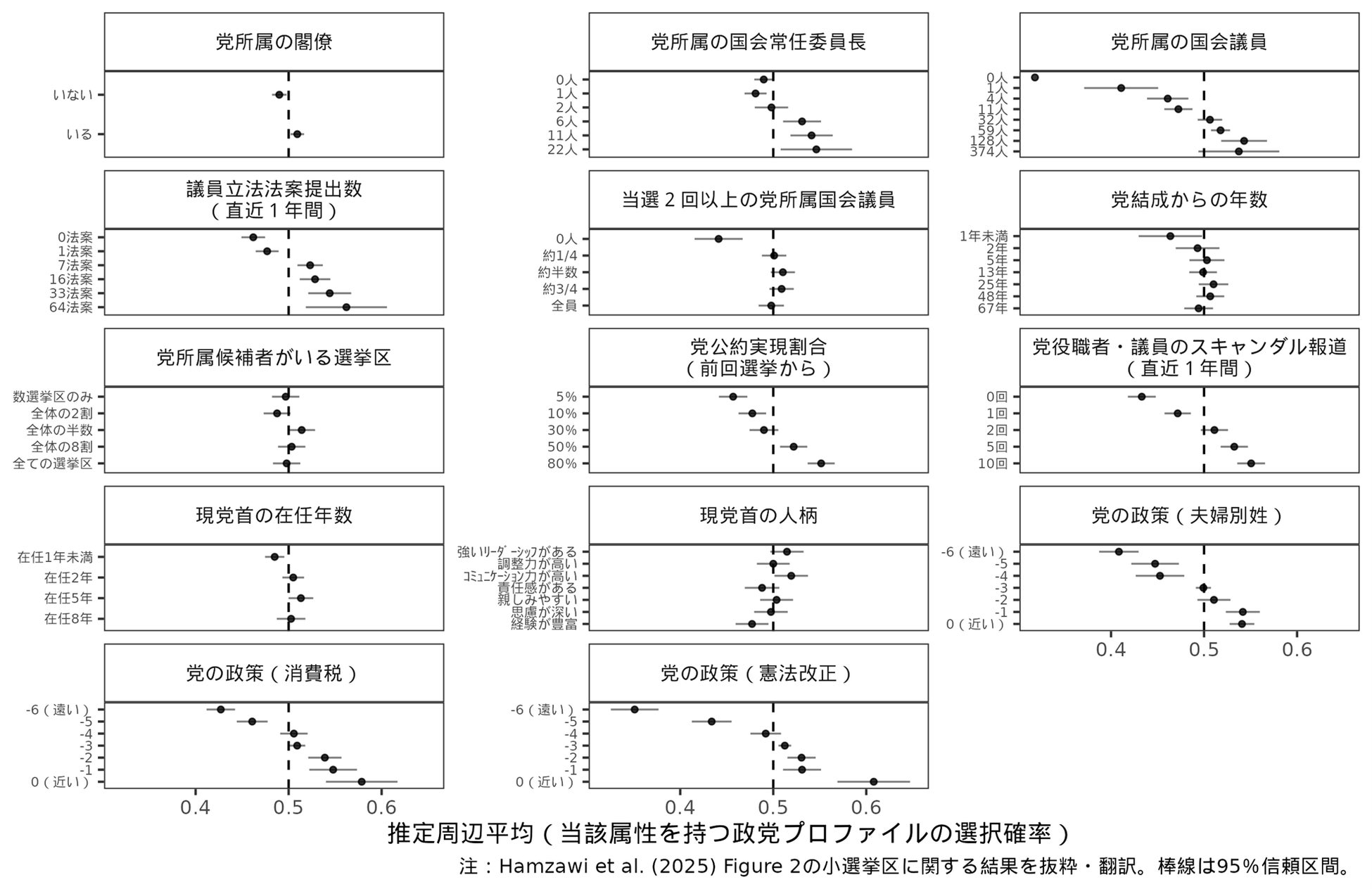 これらの結果は、有権者が政党を評価する際に、その政策だけでなく、国会での影響力や活動実績、スキャンダルなどと関連する信頼性といった具体的な「実務能力」に関わるヴェイレンス属性を重視していることを、詳細な実験データに基づいて明らかにしたものです。