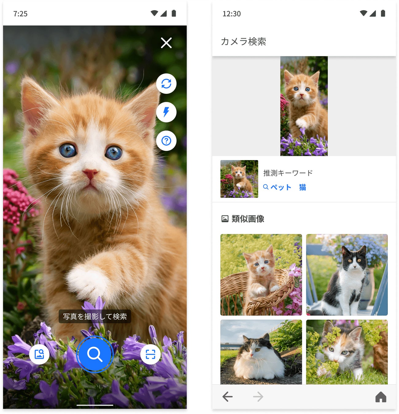 ・写真を撮影するか、「画像で検索」からスマートフォン内の画像を選択すると、検索できます。