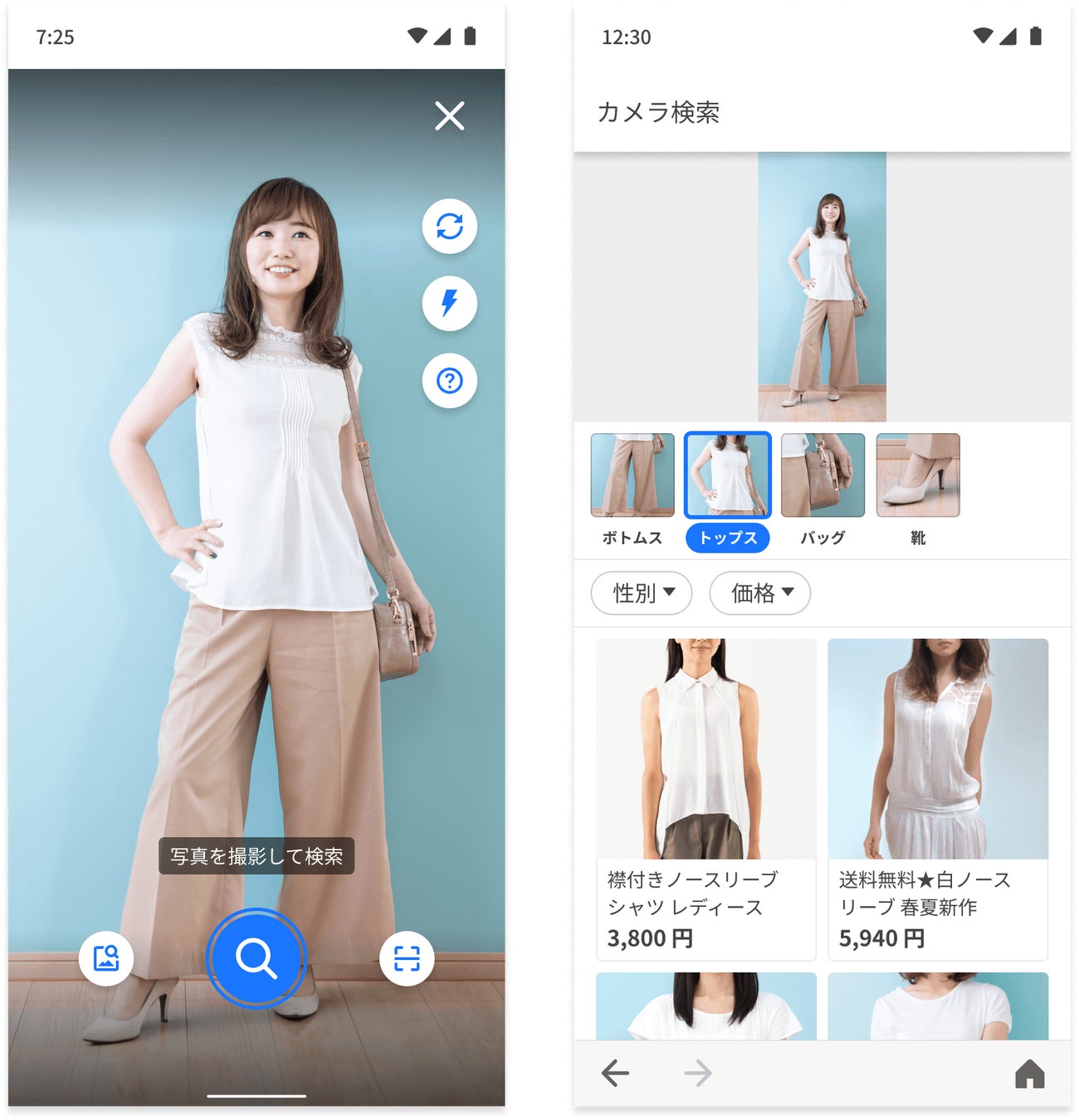 カメラ検索機能では、自分で撮影した画像や端末に保存してある画像を使用して、商品や有名人、類似画像を文字入力なしで検索できます。