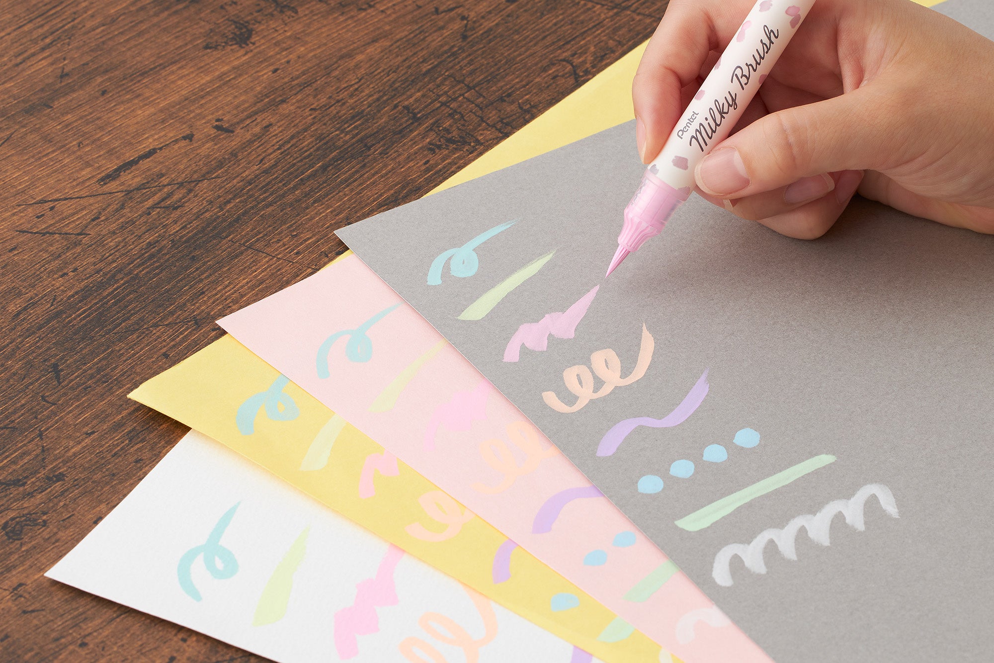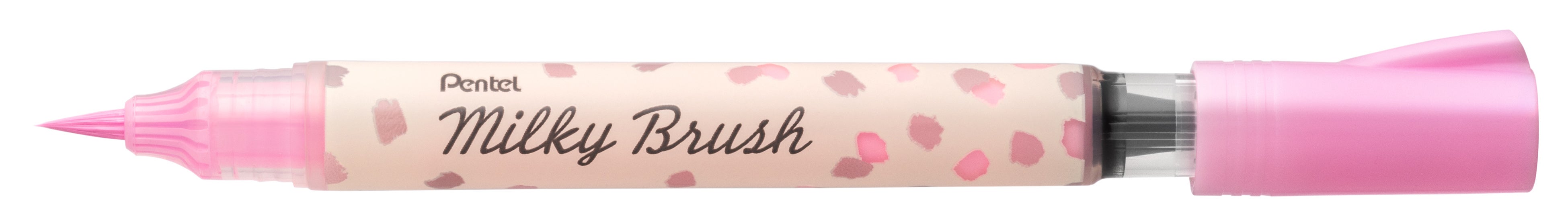 「ハイブリッドミルキー」のインキは、ぺんてるが画材や修正液で培った技術を活用して生まれ、発売当時は、黒い紙にも書ける、これまでにないボールペンとして人気となりました。30代〜40代を中心に知名度の高い「ハイブリッドミルキー」のあの“パステルカラー”をそのままに、筆ペンならではの新しい使い心地を提案するミルキーブラッシュは、当時を知る世代には懐かしく、若年世代にはこれまでにない新鮮さを感じさせる筆ペンです。