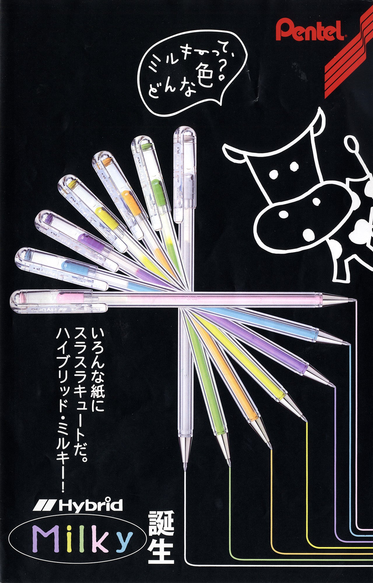 「ハイブリッドミルキー」は、1996年に発売して人気を博した、パステルカラーのボールペンです。不透明なパステルカラーゲルインキを採用したのは、業界初のことでした。黒い紙や写真シールにも書けるボールペンとして、「ミルキーペン」の愛称で小中学生を中心に一大ブームを巻き起こし、販売本数は年間1億本を突破。店頭では一時品薄状態となり、お詫び広告を出すという異例の事態となりました。