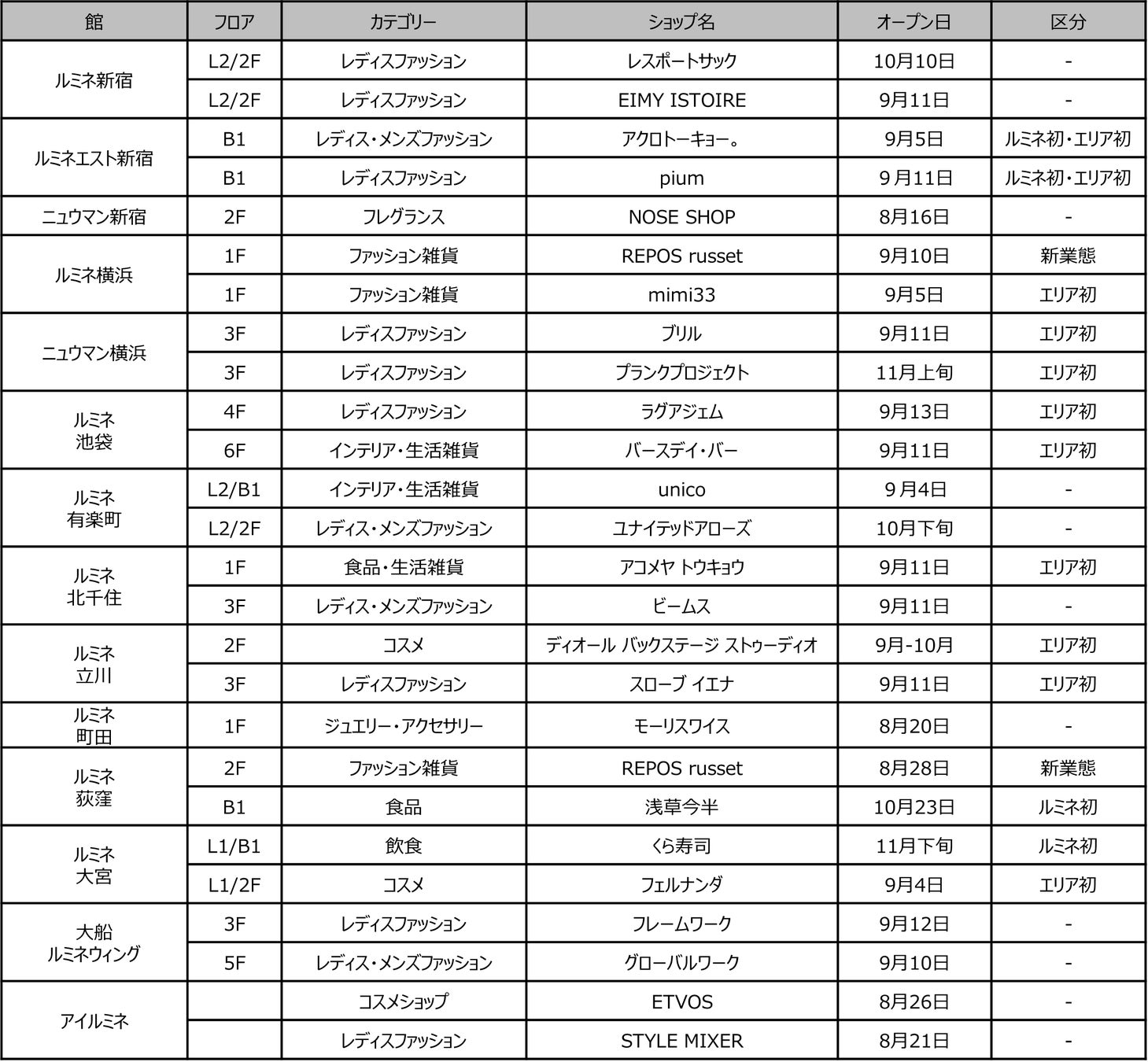 9月5日 OPEN <ルミネ初・エリア初>