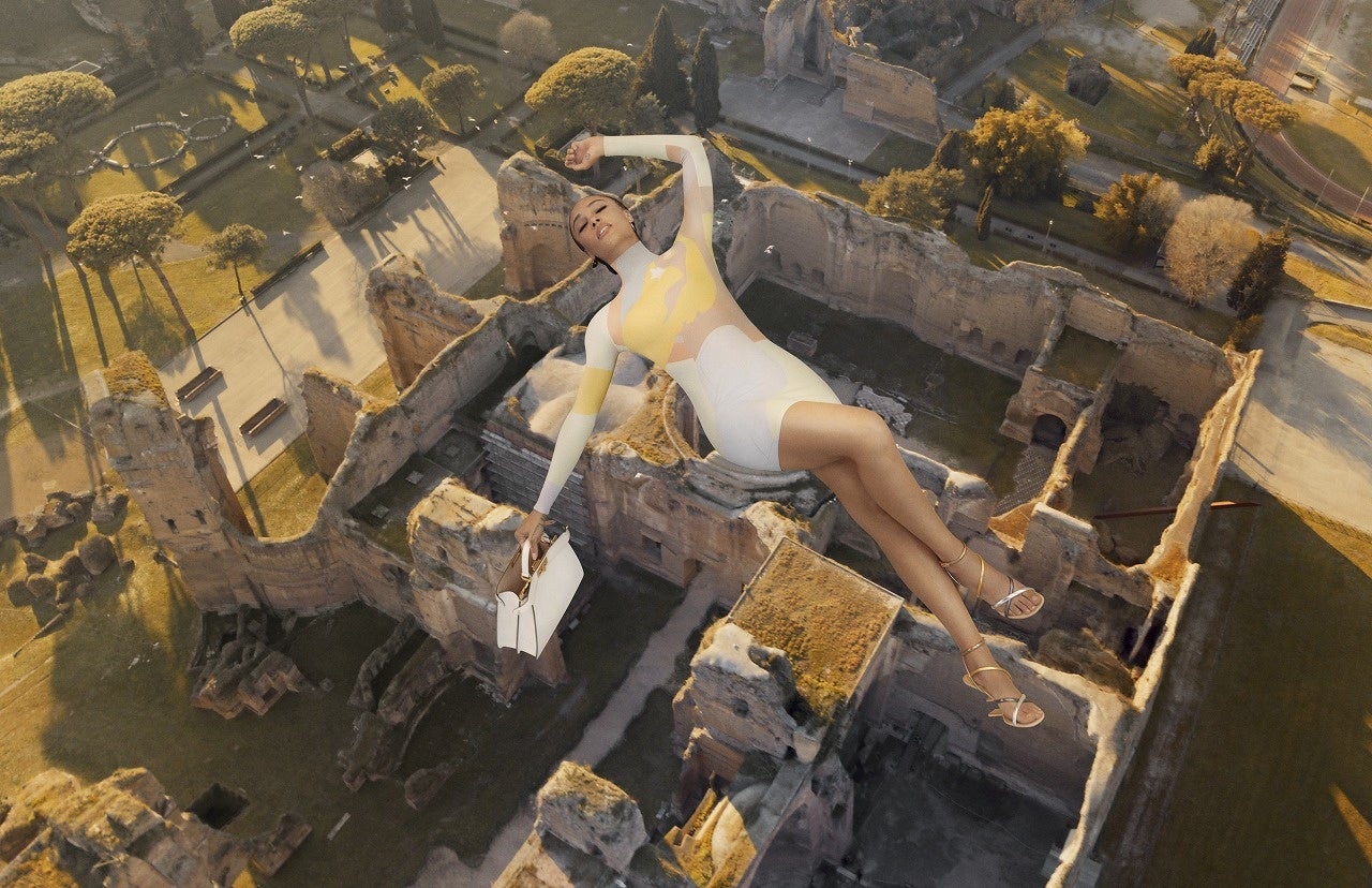 アジョア・アボアー(Adwoa Aboah)がスーパーウーマンのファッショナブルな化身として、ローマの上空を飛びフェンディが本拠を置く「イタリア文明宮(Palazzo della Civilta’ Italiana)」の石段に決然と降り立つ姿を描くこのショートムービーは、メゾンのウィットに富む特徴が吹き込まれ、フェンディをまとう女性たちの自立を明確に支持しています。ルカ・グァダニーノは、次のように続けます。「ローマというフェンディのDNAもちろんそれについて語りましたが、ローマに、ではなく、ローマの上に、です。ピーカブーの軽やかさというアイデアをストーリーの中心に据え、古都の空を飛ぶアジョアの魔法の原動力として表現したのです」