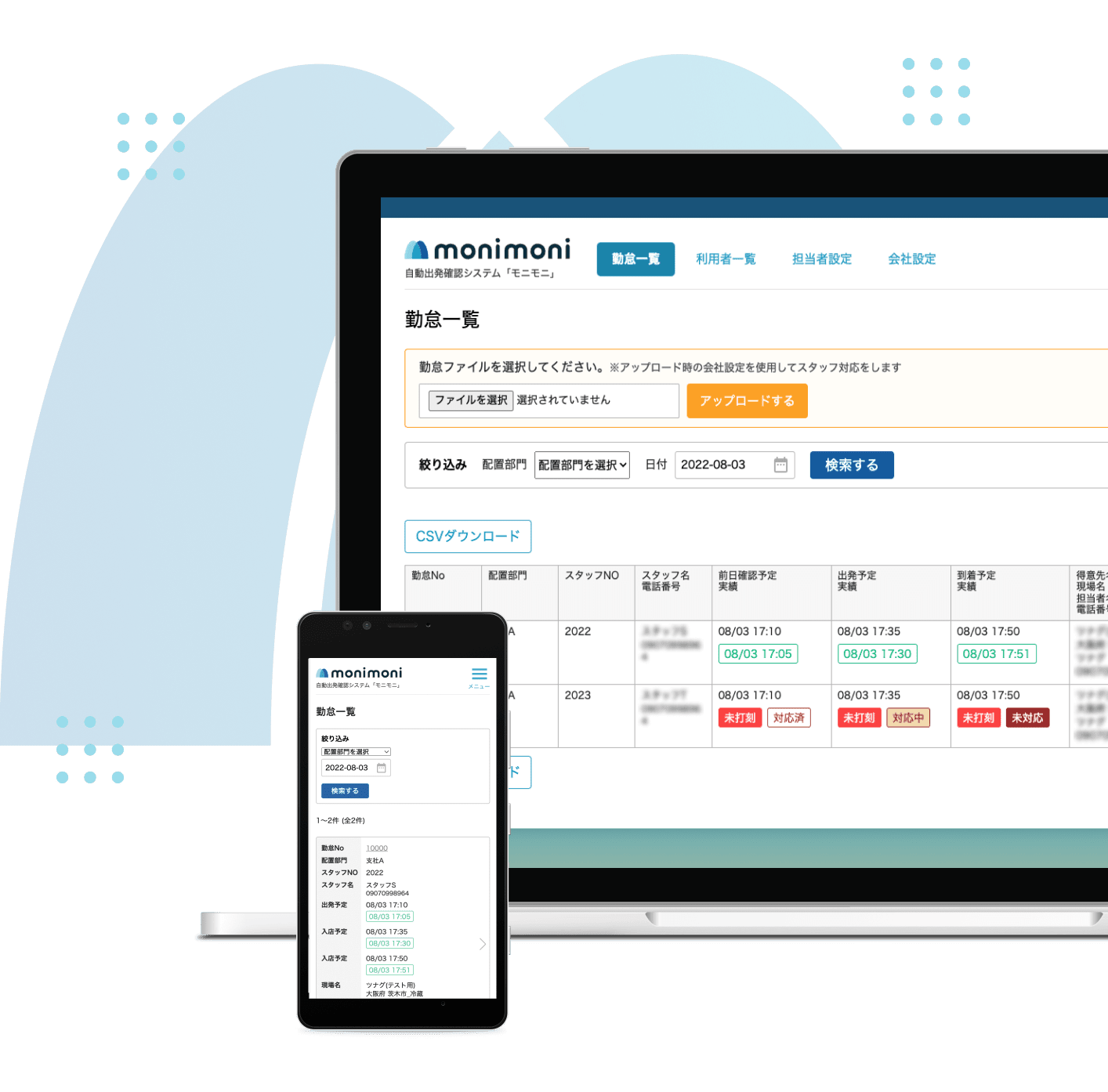 管理画面には、スタッフが連絡に反応した時間(打刻時間)が記録されていきますが、パソコンだけでなく、スマートフォンでも閲覧可能なため、担当者は現場や外出先からでも手軽に状況確認ができます。『monimoni』は、スタッフの状況確認業務に特化しているため、必要な情報だけが表示される「見やすい」「操作しやすい」管理画面になっており、複雑な操作などがなく安心してお使いいただけます。