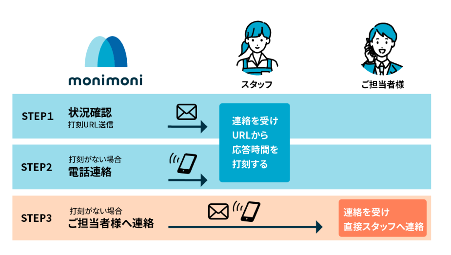 『monimoni』は複数の手段でスタッフに状況確認の連絡を行います。まずはメール(SMSも可)、スタッフの反応がなければ電話を、それでも反応がなければ担当者に連絡を入れるという3ステップを自動で行うシステムになっております。この状況確認を1回の出勤につき最大3回まで行うことができるため、確認時間や内容を自社の業務フローに合わせてカスタマイズし、有効的にご活用いただくことができます。