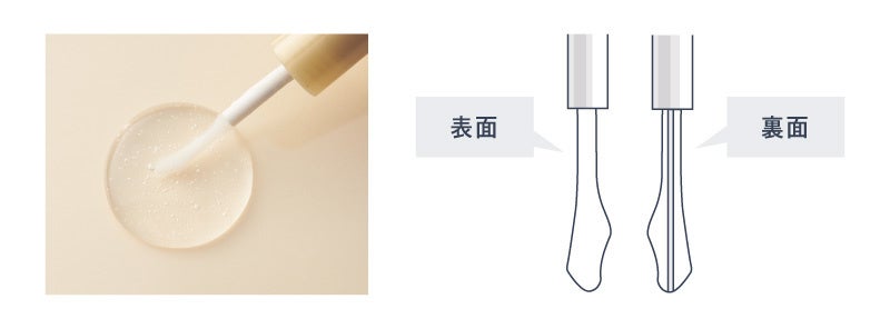 目元に摩擦が起こりにくい、肌当たりのよい触り心地で、まつげの生え際にも、毛全体にも塗りやすく、美容液がぴったりと密着します。表面で液をたっぷりとすくい、裏面の平らな部分でムラなく塗布することで、どんな短い毛も逃さずに塗ることができます。