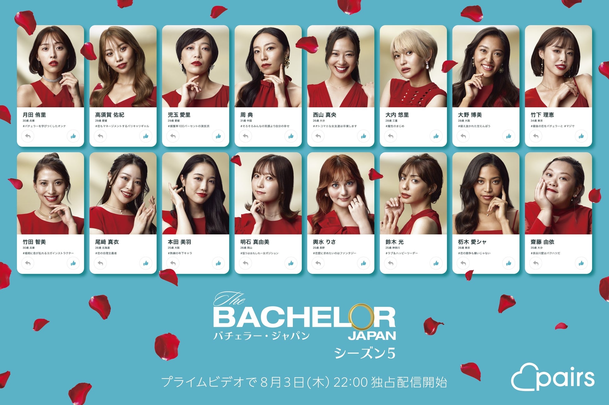 国内最大級(※1)の恋活・婚活マッチングアプリ「Pairs」(ペアーズ)を運営する株式会社エウレカ(本社: 東京都港区、代表取締役CEO: 山本竜馬)は、2023年8月3日(木)22時より配信開始となるPrime Videoの大人気番組『バチェラー・ジャパン』シーズン5の配信に先立ち、最新シーズンの世界観を表現した様々なコンテンツや、第1話の最速視聴をお楽しみいただける「『バチェラー・ジャパン』シーズン5 フライングフェス presented by Pairs」を8月3日(木)WITH HARAJUKU(東京・原宿)で開催します。(※1 MMD研究所「2022年マッチングサービス・アプリの利用実態調査」2022年9月時点)
