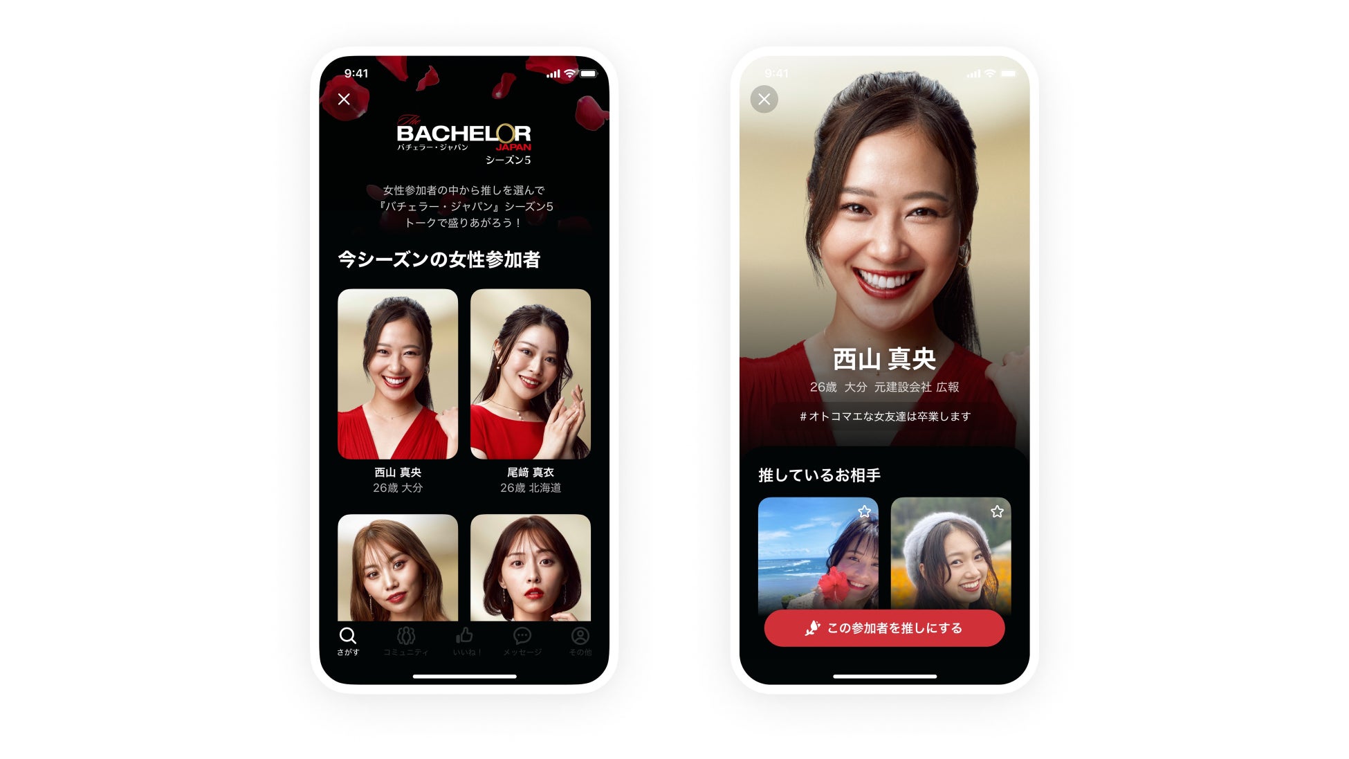 今作に登場する16名の女性から”推し”を決めると、同じ参加者を推すお相手と出会うことができ、『バチェラー・ジャパン』シーズン5の話題で盛り上がれます。