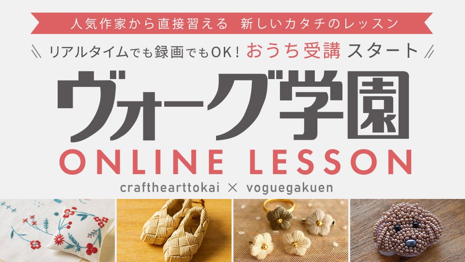 「ヴォーグ学園オンラインレッスン」は、「クラフトハートトーカイ」と手づくり専門カルチャースクールを運営する「ヴォーグ学園」がタッグを組んで開催している、ライブ配信で人気作家から直接習える新しいかたちの手づくりレッスンです。