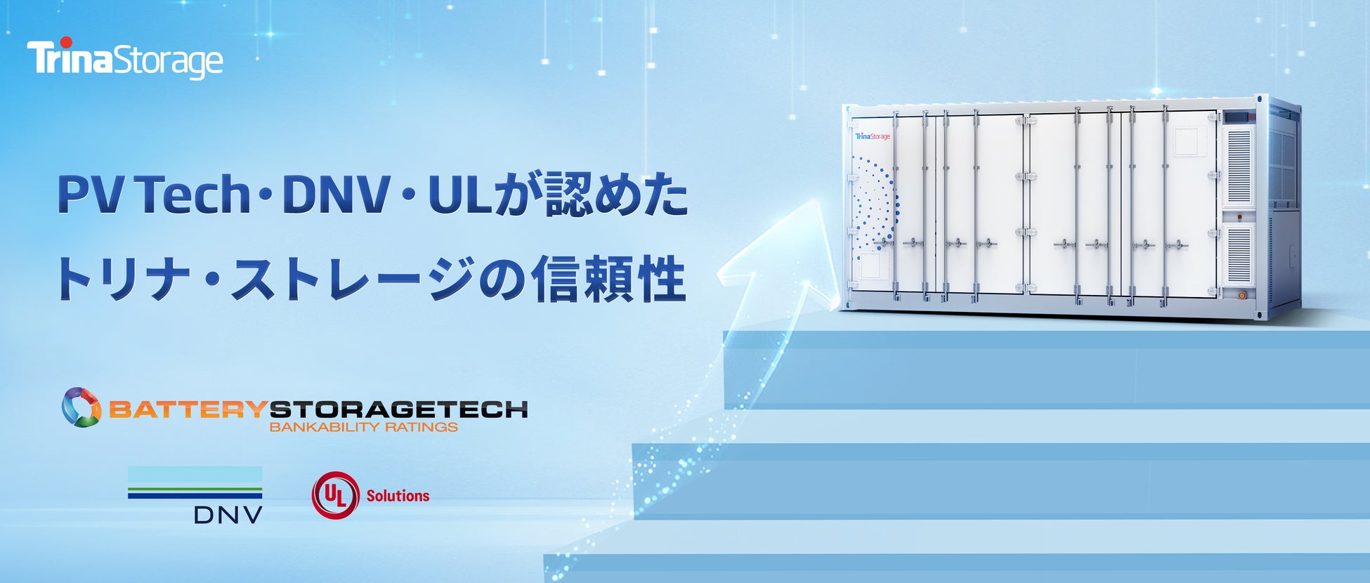 世界有数のエネルギー貯蔵製品・ソリューションプロバイダーであるトリナ・ストレージはこのたび、製品の安全性・信頼性・バンカビリティ(資金調達適合性)において、国際的な二大機関であるDNV※1およびUL Solutions※2からの認証を同時に取得しました。さらに、PV Tech Researchが発表した2025年第1四半期の「Battery Storage Techバンカビリティレーティングレポート」において評価が向上し、欧州市場における「主要市場サプライヤー」に選出されました。これらの成果は、トリナ・ストレージがグローバル市場での存在感を一層高めていることを示すものです。