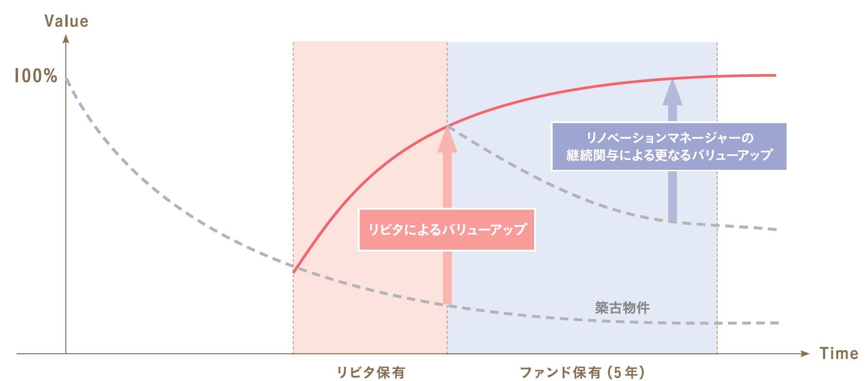 リビタとDBJグループが組成した本ファンドは、不動産価値向上とESG投資を通じた社会貢献という目的のもと設立しました。リノベーションの企画・実行力に強みを持つリビタが、ファンド組成後も中長期的な視点でリノベーションマネージャーとして改修に関するアドバイスを行うという独自の仕組みを構築。持続的なリノベーションを通じ、一室ごとの改修を重ねて建物全体の価値を高め続けます。