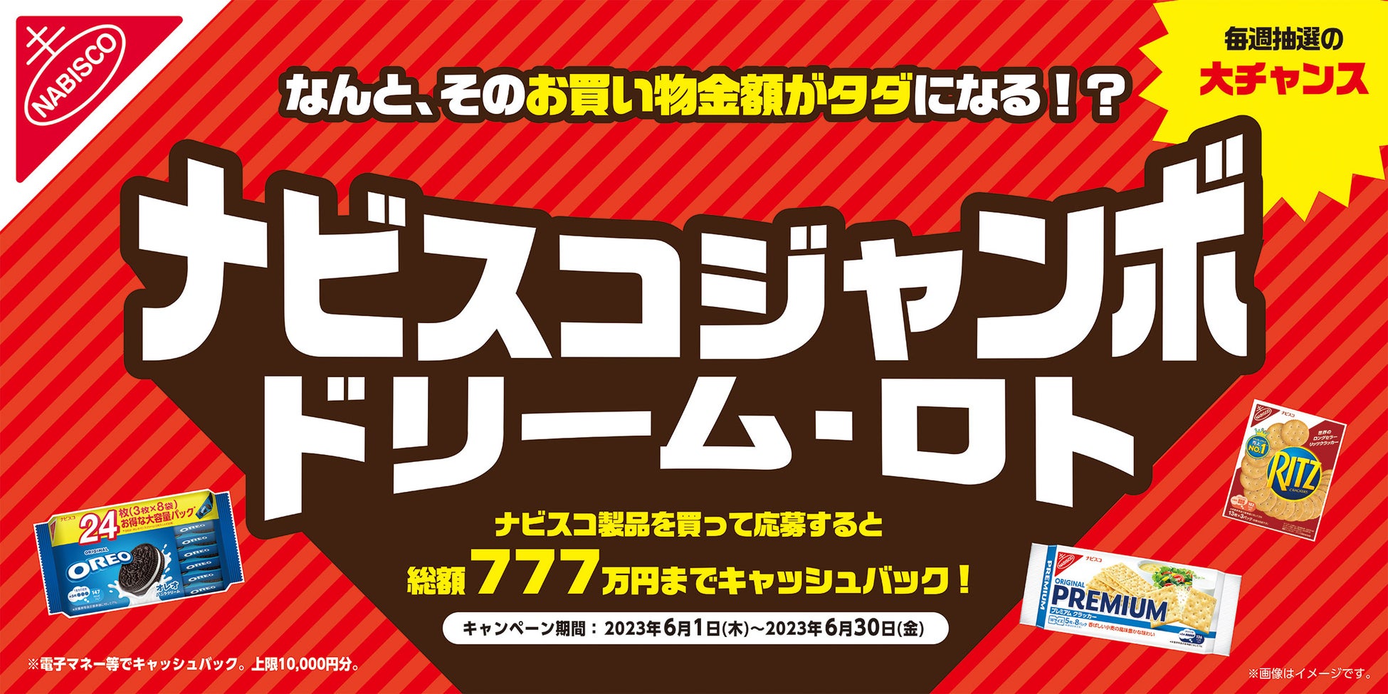 ナビスコ製品購入で、そのお買い物金額がタダに!?毎週抽選の大チャンスで、応募しない理由がない!「ナビスコジャンボ ドリーム・ロト」キャンペーン2023年6月1日(木)より開始
