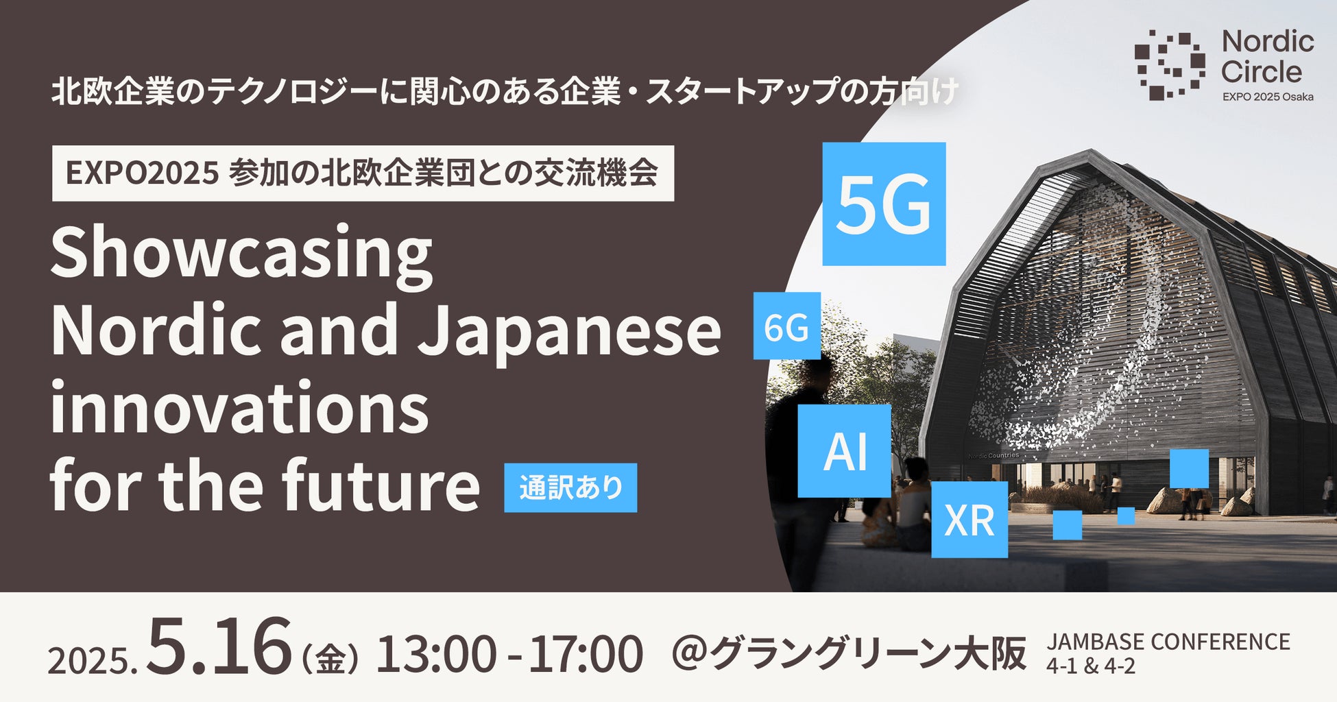 本イベントは、北欧から来日する企業・大学の代表団と、日本企業や行政との交流を図り、協業の可能性を探るべく開催されます。高速データ通信・5G/6G・AI・XRなどの最新分野における北欧の知見や技術を、北欧企業のテクノロジーに関心のある日本企業やスタートアップ、行政に紹介します。