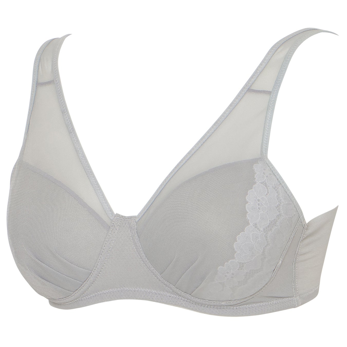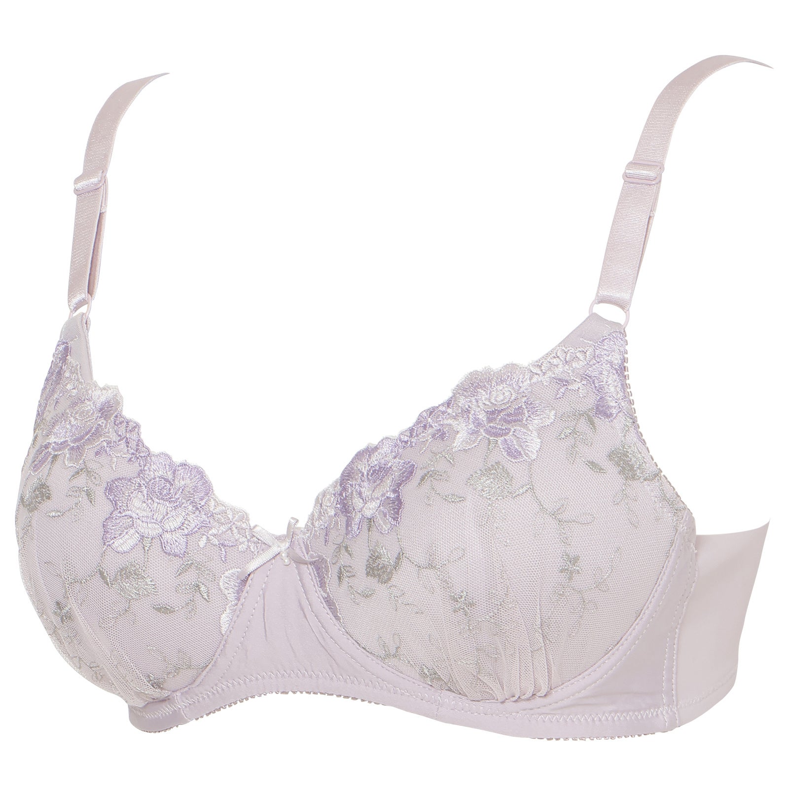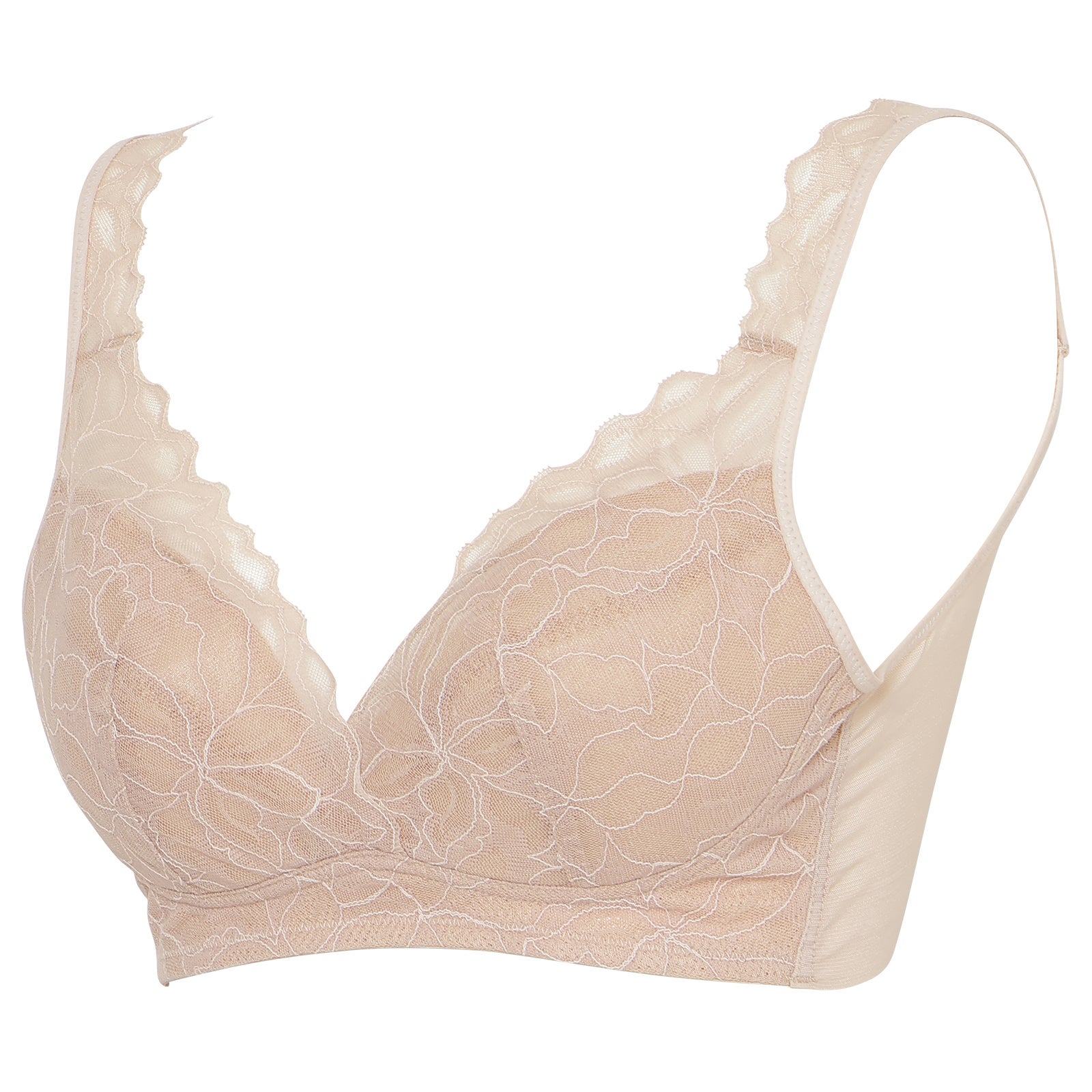 自然な丸みのあるシルエットを作るシームレスカップのノンワイヤーブラ。脇上部分はフリーカット仕様でくいこみにくい設計です。華やかな3色切替のチュールレースを使用しています。