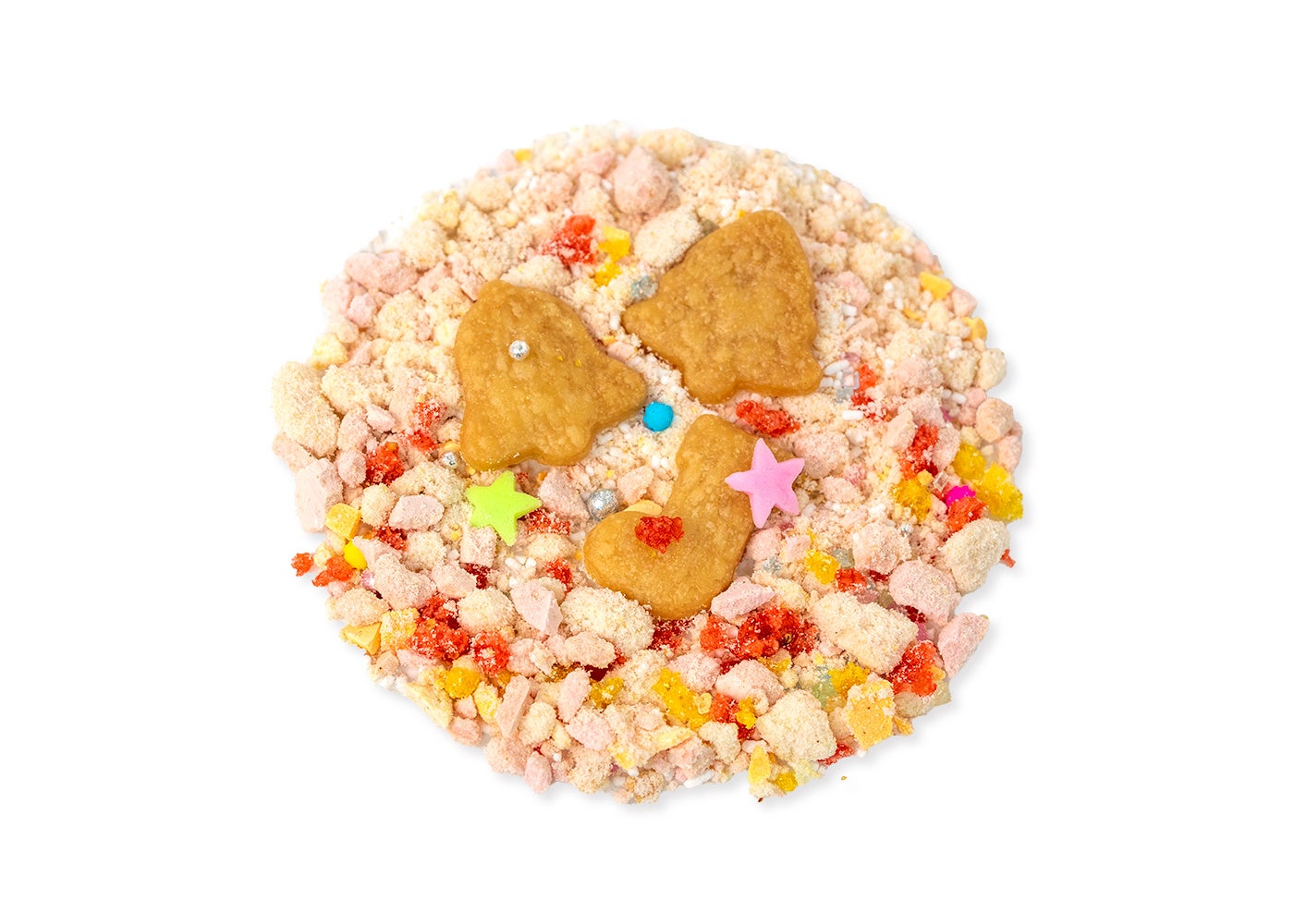 「クリスマスケーキふりかけ」は、クリスマスケーキの味わいをそのままふりかけに再現した、贅沢で華やかなトッピングです。ベースにはビスキュイジョコンドを使用し、ストロベリーとマンゴーのクリスタルメレンゲチップや、濃厚なマスカルポーネチーズを組み合わせています。さらに、別添えのトッピングはツリー、鐘、靴下型のサブレ、星型のシュガークラフト、アラザンを散りばめたデザインで、見た目にも楽しめる仕上がりです。