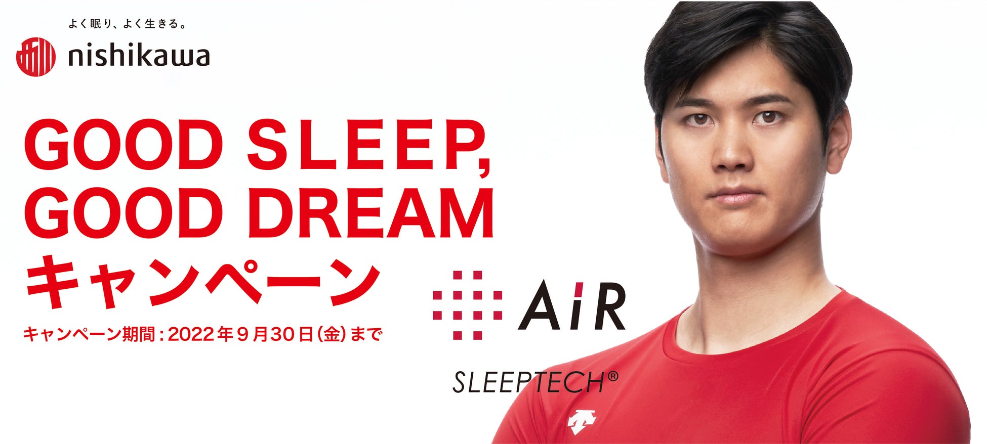 西川株式会社は、睡眠の秋に向けて、ロサンゼルス・エンゼルスの大谷翔平選手をイメージキャラクターに起用した、コンディショニング・マットレス[エアー]の「GOOD SLEEP, GOOD DREAM キャンペーン」を9月9日(金)から9月30日(金)の期間で開催します。