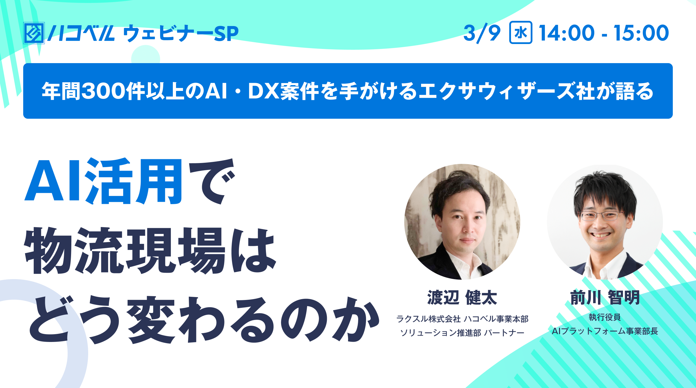 物流プラットフォーム「ハコベル」を展開するラクスル株式会社(本社:東京都品川区、代表取締役社長CEO:松本恭攝、以下:ラクスル)は3月9日(水)に、株式会社エクサウィザーズ 執行役員 AIプラットフォーム事業部長 前川 智明 氏をお迎えし「-年間300件以上のAI・DX案件を手がけるエクサウィザーズ社が語る- AI活用で物流現場はどう変わるのか」を開催することをお知らせいたします。