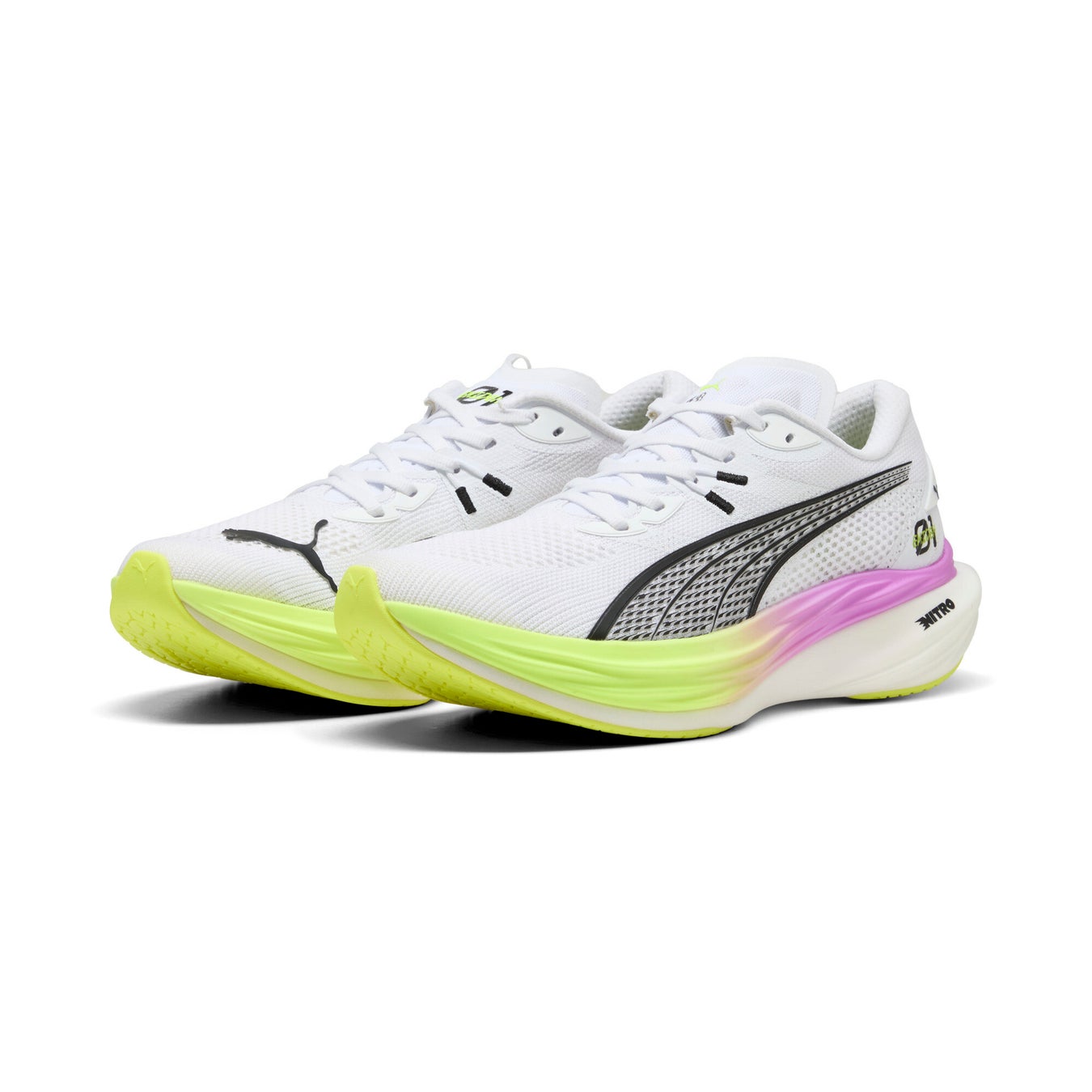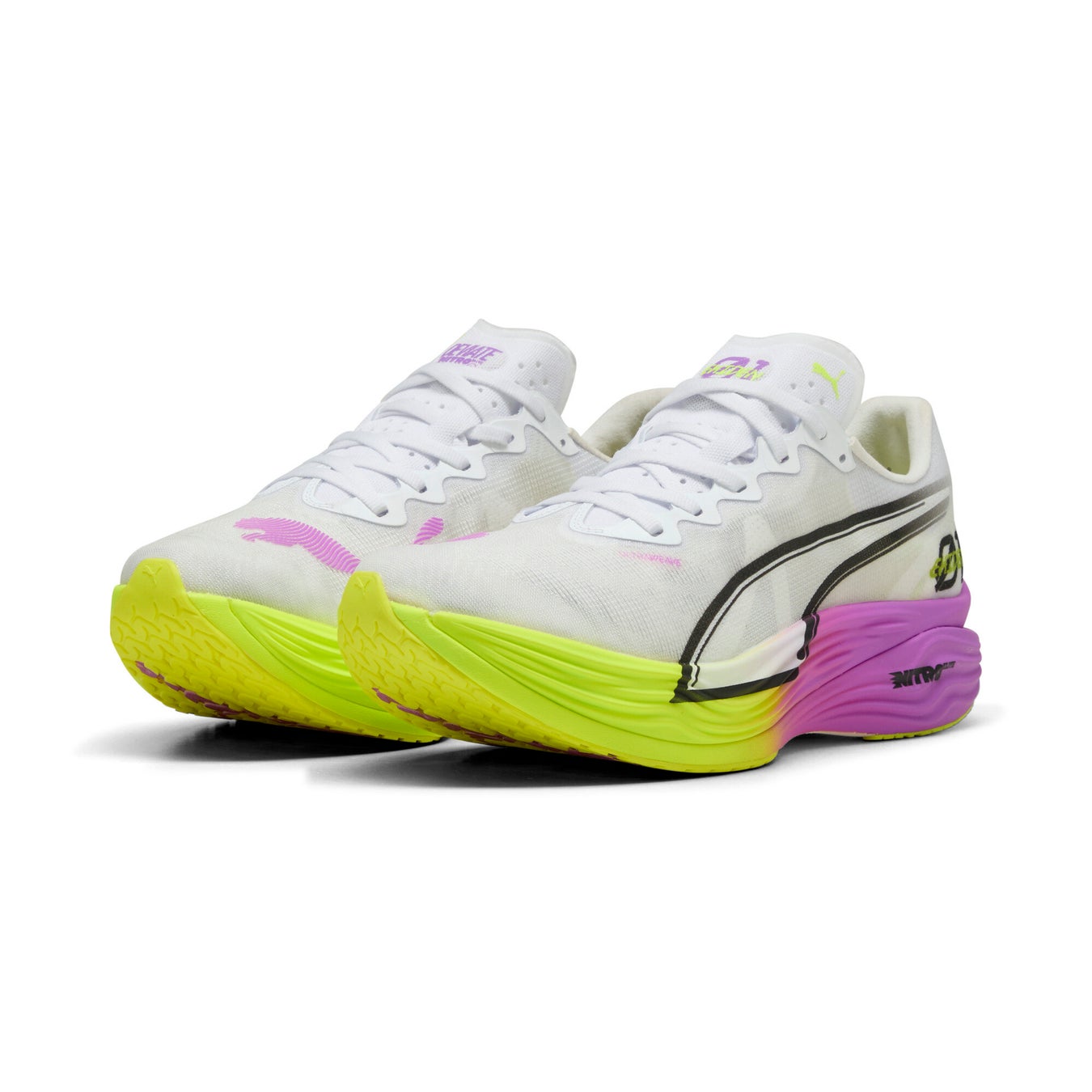 前作より4mm厚くなったミッドソールは、プーマの革新的なNITROFOAM TM ELITE技術を搭載し、優れたエネルギーリターンを実現します。アッパーには、プーマ独自の軽量ウーブン素材ULTRAWEAVEのモノメッシュを使用、通気性を高め、PWRTAPEでストレスのかかる部分を補強しています。重量わずか194g (27.0cm)の史上最軽量クラスのシューズで、圧倒的なスピードによりレース本番で の自己ベスト更新を後押しします。