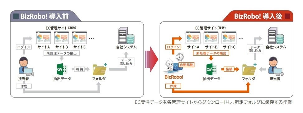 BizRobo!の開発運用に携わったフルフィルメント課のメンバーは当初、RPAに関する知識・経験がない状態からスタートしましたが、RPAテクノロジーズが提供するe-ラーニングコンテンツの受講や、同福岡オフィスによる開発指導により技術を取得。「自社ECとモール出店の合計4サイト分の売上集計」や、「売上以外で生じた在庫変動をExcelの記録から基幹システムに随時反映」など、計7つの業務の自動化に成功しました。