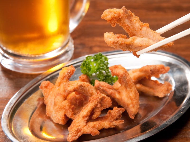 押しのメニューは、もも・レバー・せせりなどその日のお薦め部位6種を盛り合わせ食感や味わいの違いを楽しめる「ミックス焼き」(通常780円税込)や、もも肉1本分の豪快な「特大もも焼き」(通常980円税込)、特製塩ダレで漬け焼きにする全く臭みがないと評判の「ハツ焼き」や「レバー焼き」(各通常480円税込)など、絶妙な火加減と塩加減で部位それぞれの旨味を最大限に引き出します。加えて、希少部位“Vチキン”をカリッとスパイシーに揚げた「勝利の唐揚げ」(通常500円税込)は、キリっとした辛口生ビールのアサヒスーパードライと相性抜群。