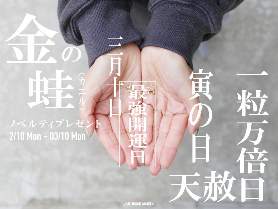 JAMHOMEMADEでは最強開運日に合わせて、開運チャーム“金の蛙”ノベルティプレゼントフェアを開催しています。3月10日、2025年最初の最強開運日に向けて開催予定です。数に限りがございますのであらかじめご了承ください。
