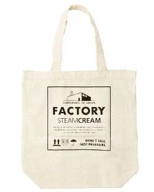 「STEAMCREAM FACTORY」ロゴ入りのコットンエコバッグ(385円/税込)。スタッフの声から生まれたこのエコバッグは、薄くて軽く、バッグやポケットに忍ばせておくのに最適。