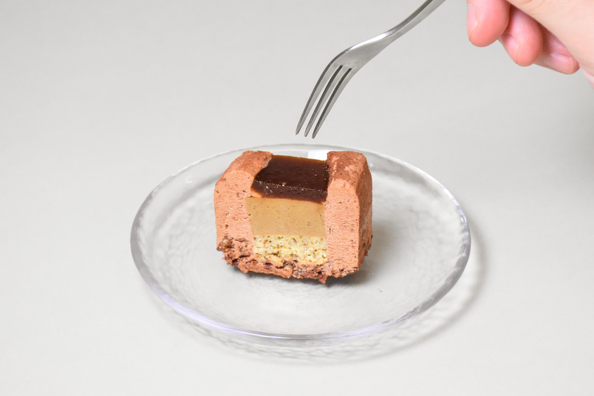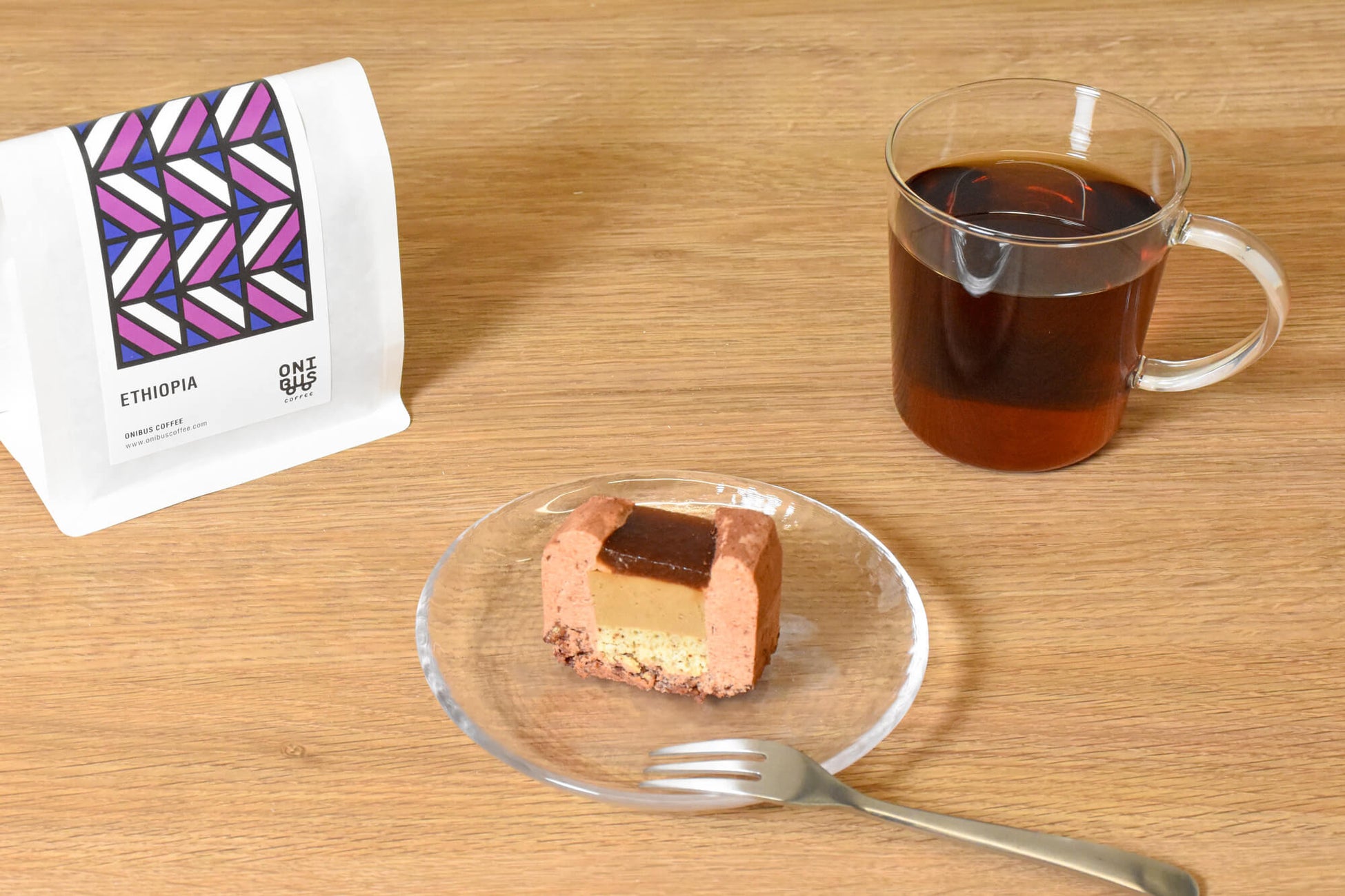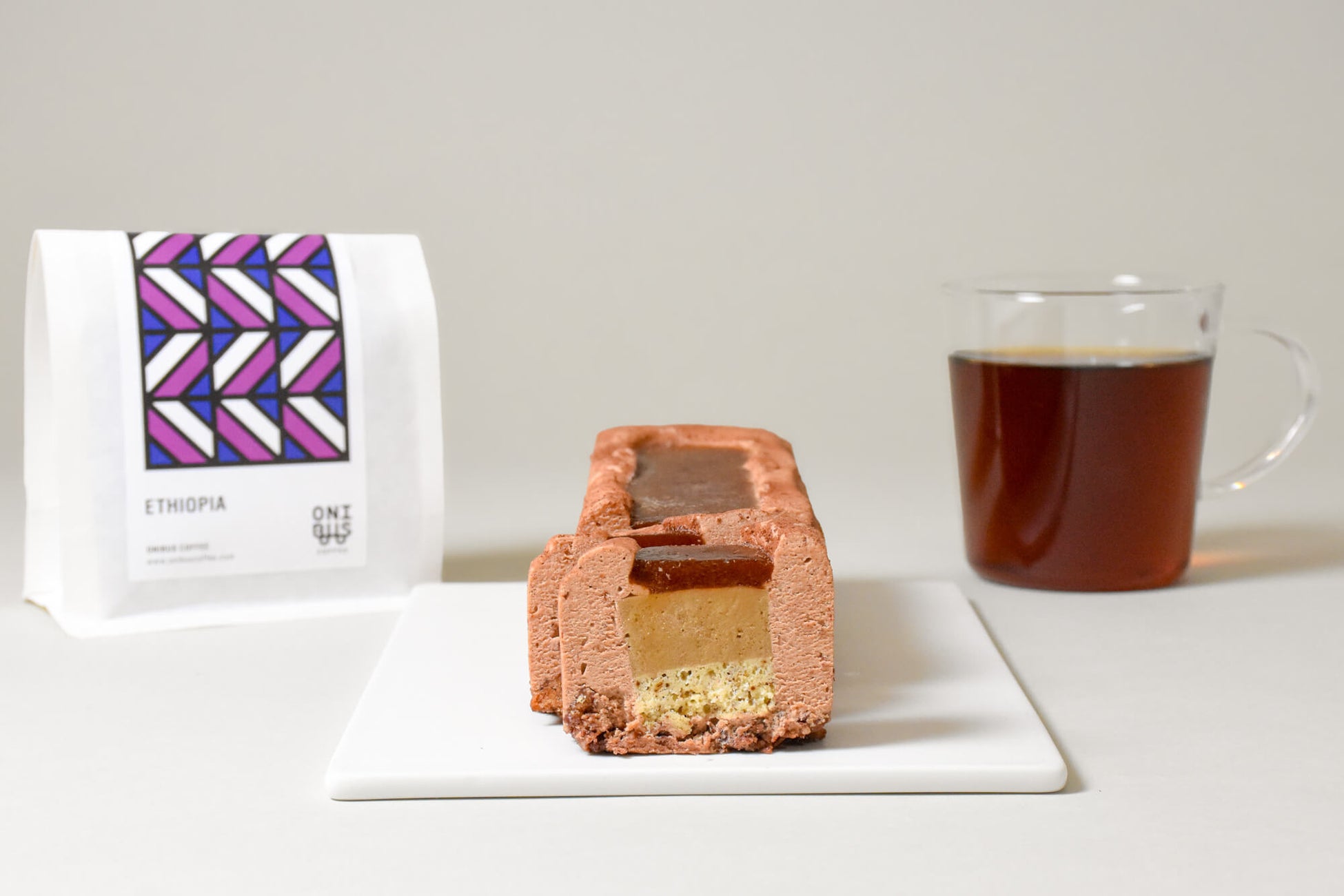 今回使用しているのは、「ONIBUS COFFEE(オニバスコーヒー)」のエチオピア産コーヒー豆です。抽出すると、ライチのような優しい甘さとダージリンのような上品で落ち着いた印象のある味わいになります。その豆を、エスプレッソや粉の状態にしてアーモンド生地やクレムー、ゼリーにたっぷり用いました。