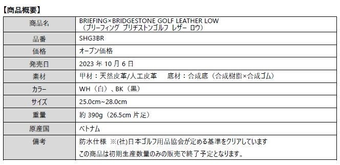 ブリヂストンスポーツ株式会社は、ラゲッジブランドBRIEFINGが培ってきたミリタリズムをベースに、継続性のある機能美を追求し、都会とゴルフシーンをブリッジ可能なスタイリッシュなアイテムを展開する「BRIEFING GOLF」とコラボレーションした、スパイクレスシューズ『BRIEFING×BRIDGESTONE GOLF LEATHER LOW』を10月6日に発売します。価格はオープンです。