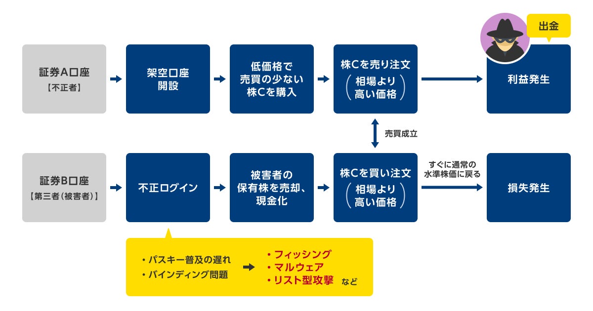 オンライン証券口座を狙った不正アクセスが相次いでいます。金融庁は、不正取引額が今年1月から4月末までの合計で3,000億円超に拡大したと発表しています※1。不正者は、フィッシングやマルウェアなどにより口座を乗っ取り、取引量の少ない株を使った不正売買に悪用しています。自らの口座で高値の売り注文を出し、乗っ取った口座から買い注文を出し価格をつり上げ、利益を得る手口です。結果、乗っ取られた口座に損失が残ります。