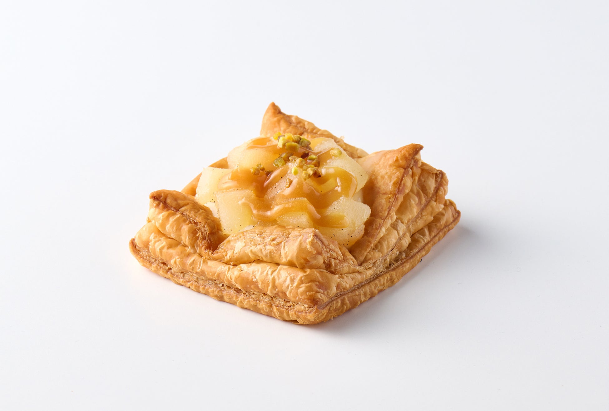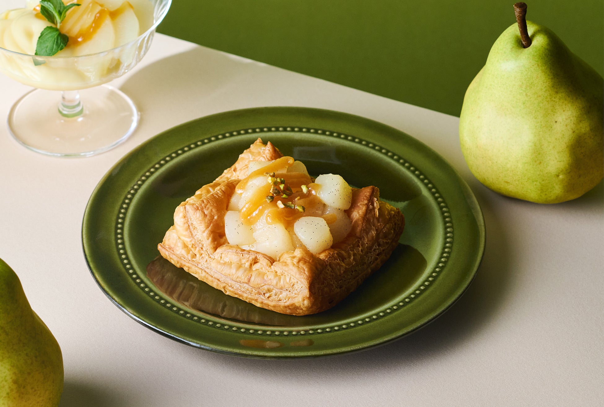 丁寧に折り込んで焼き上げた、729層のサクサク食感のパイ生地に、RINGOオリジナルのカスタードクリームをたっぷり絞り、バニラの風味を纏わせた洋梨のコンポートを贅沢に盛り付けました。天面には、甘い香りを漂わせた艶やかなキャラメルソースを重ね、洋梨のみずみずしさを一層引き立てています。最後にグリーンのピスタチオをあしらい、華やかな彩りを演出しました。
