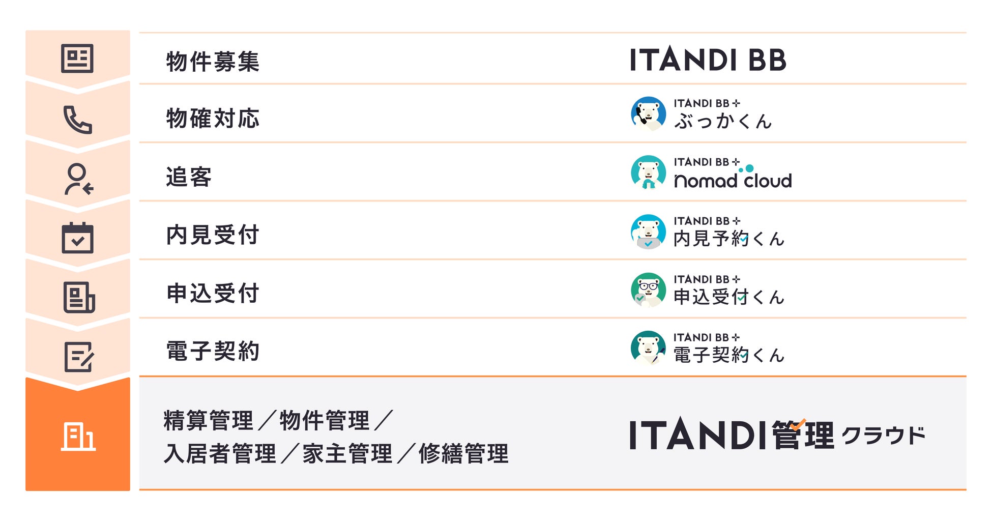 ITANDI BB +は、顧客管理から、物件検索/空室確認・内見予約・入居申込・賃貸借契約・更新退去・原状回復工事までを一気通貫でサポートし、精算管理・物件管理などの賃貸管理機能も有する、不動産賃貸業務のDXサービス群です。現在、約2,000社の不動産会社で導入、約51,000店舗の仲介店舗で利用されています。