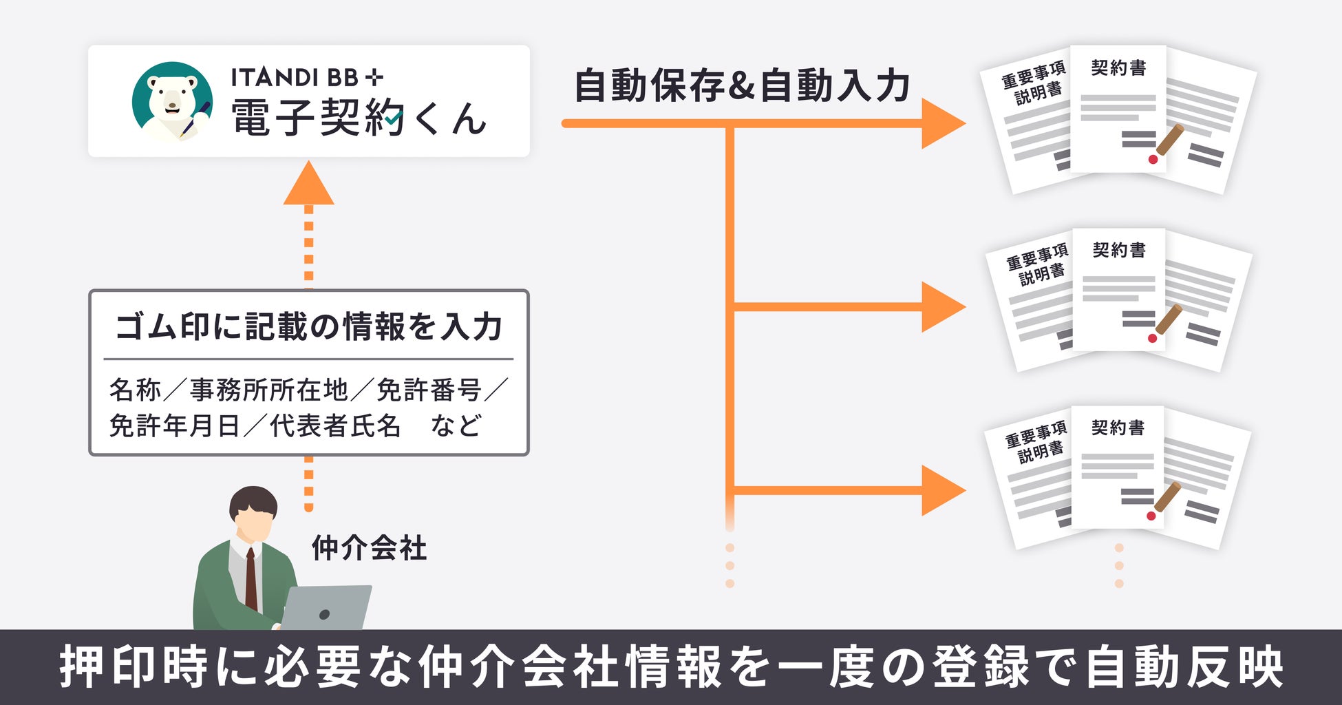 一般的な紙の契約書による賃貸借契約において、仲介会社が契約書に押印する際に、事務所の名称、事務所の所在地、宅建免許番号など、契約に必要な自社情報が全て印字されたゴム印を使用しています。一方で、「電子契約くん」を使った電子契約においては、ゴム印に記載された約10項目の仲介会社の情報を、契約毎に仲介会社自身が手動で入力、または不動産管理会社が代理で入力するなど手間のかかる作業が発生していました。