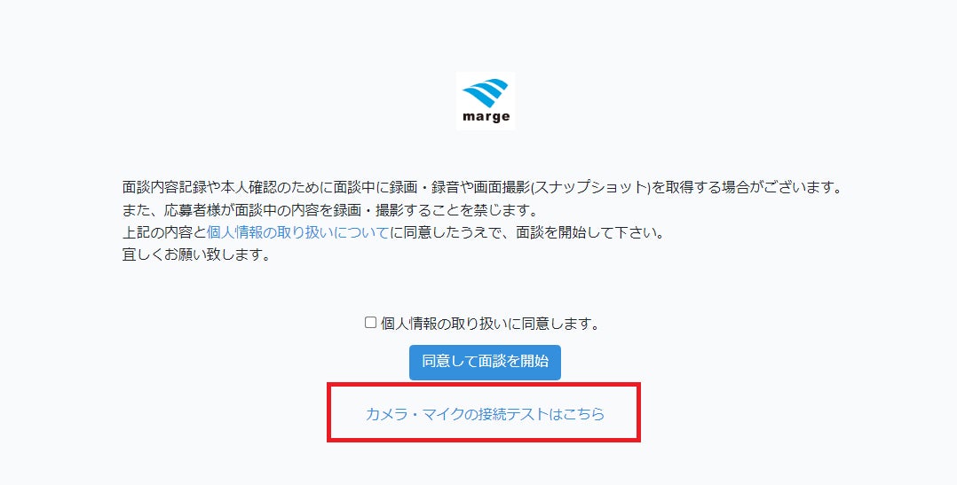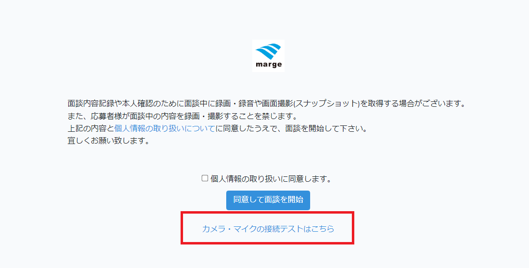 この仕様に加え、今回多数のご要望をいただき、面接開始時間後であっても面接ルーム入室直前にテストページへのリンクを設けて入室前にいつでもカメラ・マイク、ネットワーク通信のテストができるように改良致しました。