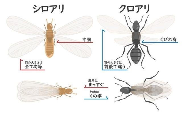 シロアリとクロアリの羽アリの簡単な見分け方は下図です。