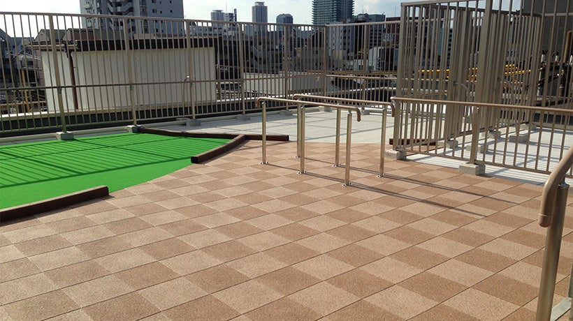 近年、都市部の土地活用や環境問題に対する対策として、建物の屋上を有効活用するケースが増えています。一般的なゴムチップや人工芝の場合、表面温度が60℃近くなることもあり、熱中症だけでなく、上層階の室内温度上昇につながることが課題となっていました。
