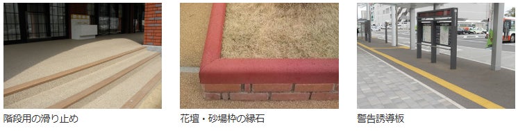 当製品はエチレンプロピレンゴム(EPDM)を使用しているため、耐候性や防滑性にすぐれ、適度な弾力性で快適な歩行感が得られます。タイルのデザインは、複数色のチップを混合して成型しているため、自然な色調で空間に調和します。その他、階段用の滑り止めや花壇・砂場枠の縁石など、用途に合わせた安全対策部材も各種取り揃えています。