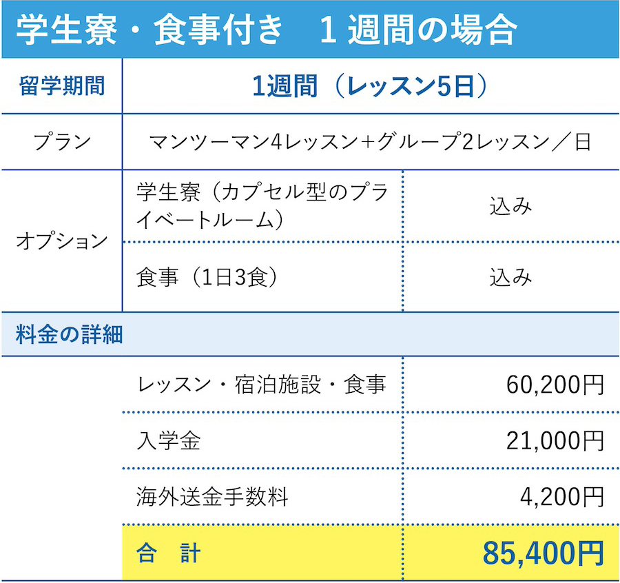 親子で参加 ※お子さま1名、保護者さま1名分 | 1週間:343,500円 2週間:474,900円 4週間:672,000円 |