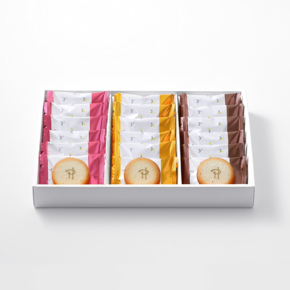 可愛らしい丸形のラング・ド・シャ。定番のミルクチョコレートとビターチョコレート、独創的な「イスパハン」、3種18枚の詰合わせです。3種の味わいのチョコレートをラングドシャのさくさくとした歯触りとともにお楽しみいただけます。軽く持ち運びやすいため人気商品です。
