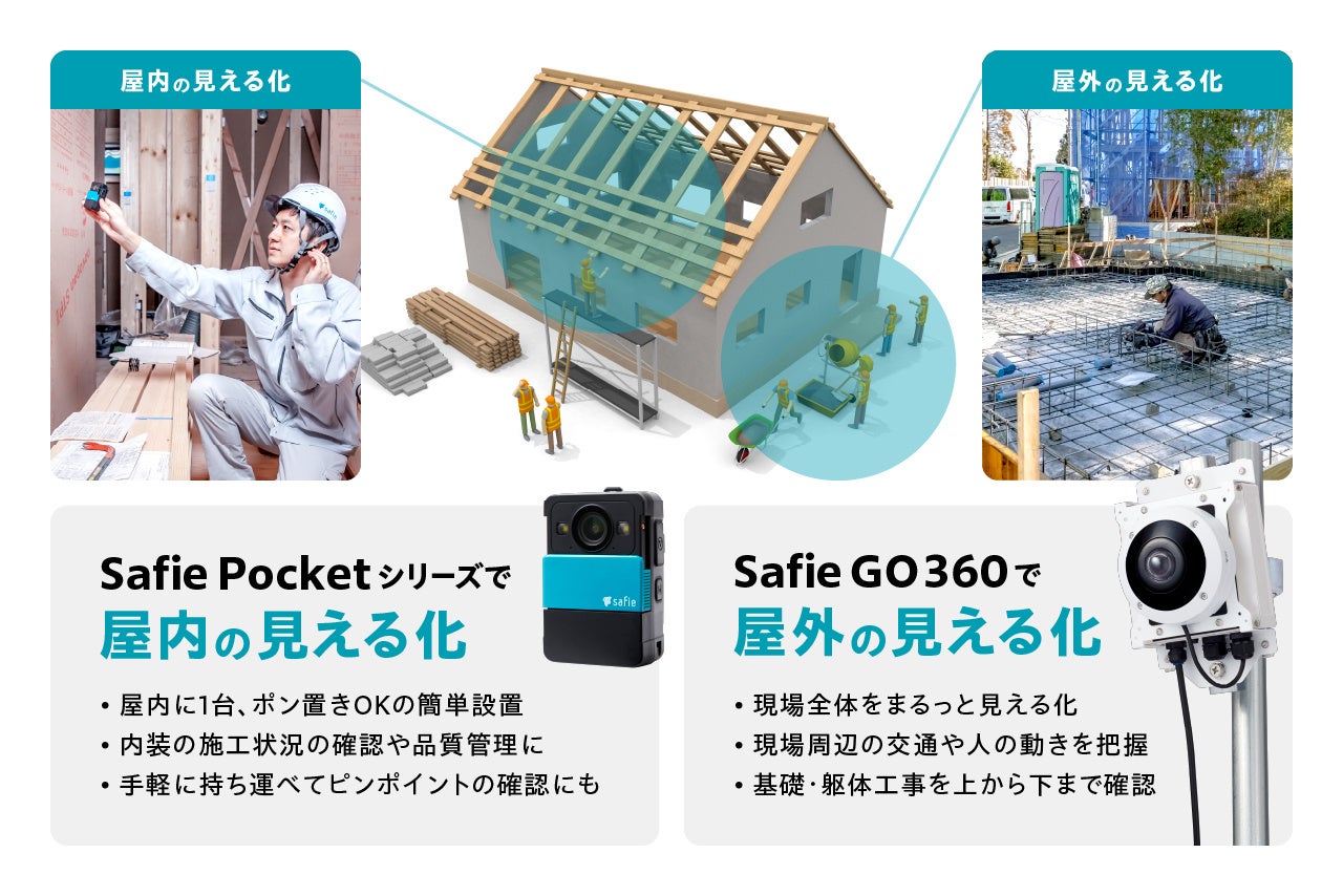 さらに、外部には「Safie GO 360」1台を1度設置することで現場周辺を隅々まで見える化、内部には「Safie Pocket(セーフィー ポケット)」シリーズを置くことで都度内装の確認したい箇所を詳細に確認でき、両者の併用によって戸建て住宅現場全体を見える化し、遠隔からの進捗管理を実現できます。