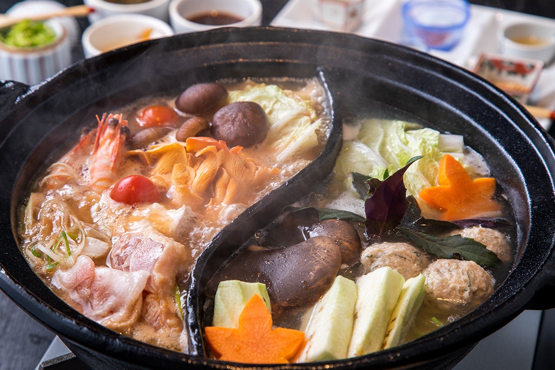 2種類のスープでお楽しみいただく「ひなた鍋」。それぞれのスープの旨味や、味比べを楽しみつつ、こだわりの具材も見逃せません。さらに、本プラン限定でお造りは特別バージョンに。飫肥で作られている醤油「飫肥のむらさき」をベースにブレンドした特製の燻製醤油に奥日向サーモンを漬け込みました。デザートの「米粉のラムレーズンブッセ」も本プラン限定!米粉の生地で作ったブッセに、栗とノンアルコールのラム風味レーズンをマスカルポーネクリームと混ぜ合わせサンドしました。
