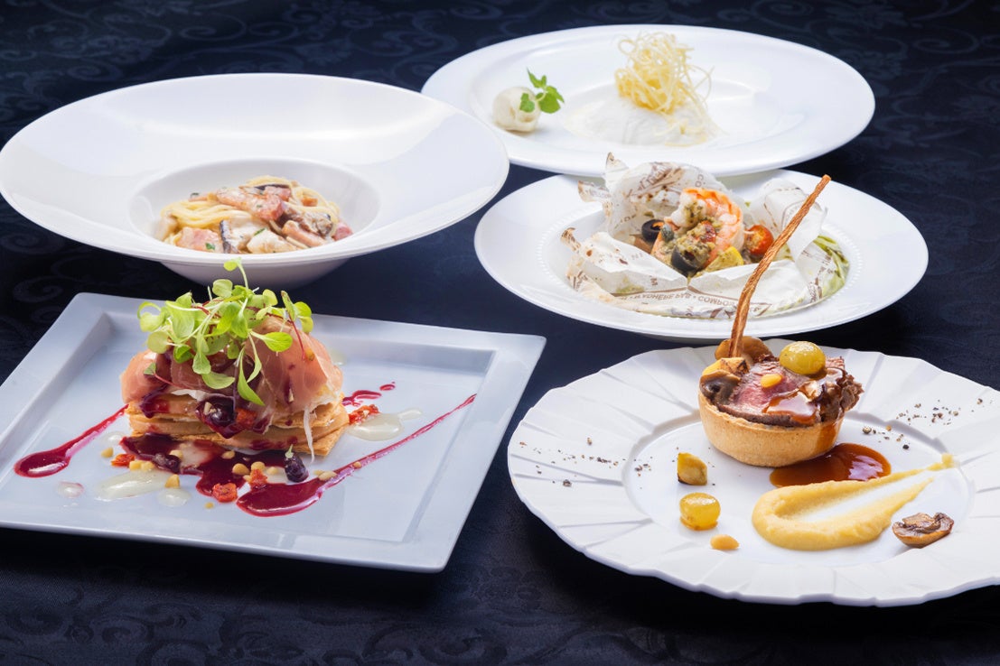 見た目も鮮やかに仕上げたミルフィーユに、宮崎県産食材である綾姫茸を使ったパスタや、バジルバターの香りを閉じ込めた奥日向サーモンのソテーなど、一品一品が繊細でありながらも秋の訪れを愉しむコースに仕上げました。本プラン限定のドルチェ「マスカットのジュレ クレーム・ダンジュ」は、なめらかな食感のレアチーズの中に甘酸っぱいマスカットのジュレと果肉を入れ、コク深いキャラメルソースとの相性も抜群の一品です。