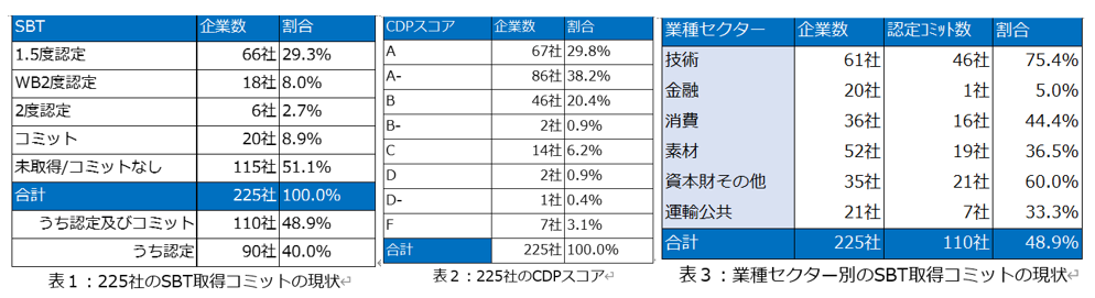 これらの結果は、日本を代表する大企業の間でSBTの設定が浸透してきていることや、気候関連の情報開示を適切に実施することが「標準」であるという認識に近づいてきていると推察できます。他方、225社のうち半数がSBTの設定ができておらず、取り組みが進むセクターと遅れるセクターの差が開きつつあることや、十分な情報開示に取り組めていない企業が一定数あることも示しています。