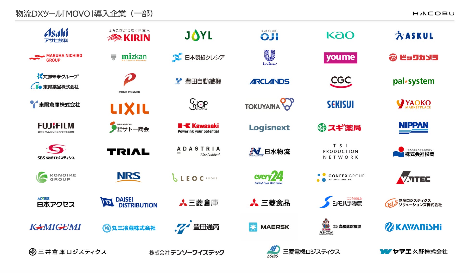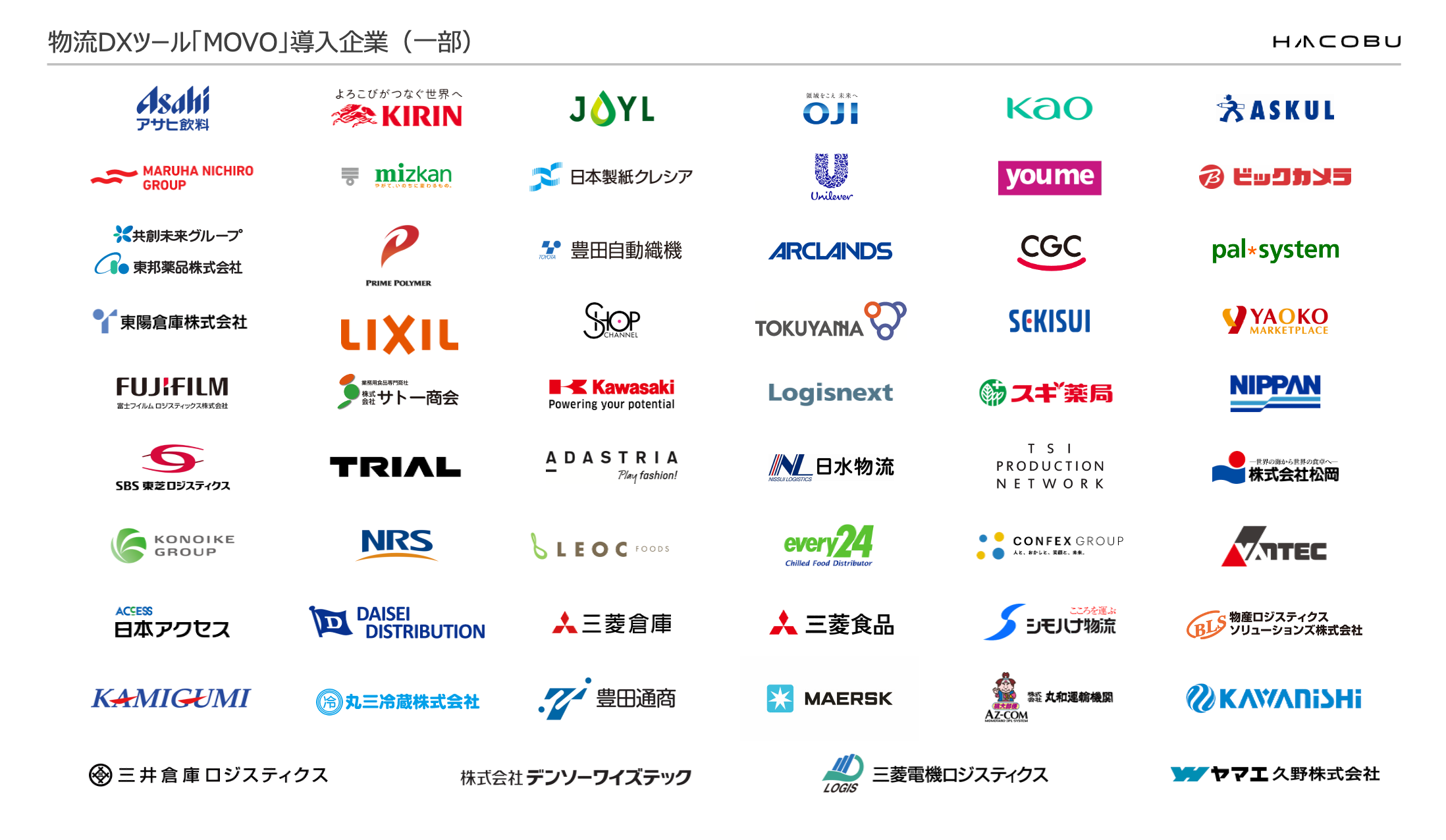 事業内容:クラウド物流管理ソリューション「MOVO(ムーボ)」シリーズと、物流DXコンサルティング「Hacobu Strategy(ハコブ・ストラテジー)」を展開。 シェアNo.1(※2)のトラック予約受付サービス「MOVO Berth」、動態管理サービス「MOVO Fleet」、配送案件管理サービス「MOVO Vista」などのクラウドサービス、ドライバーの業務を効率化するスマホアプリ「MOVO Driver」の提供に加え、物流DXパートナーとして企業間物流の最適化を支援しています。