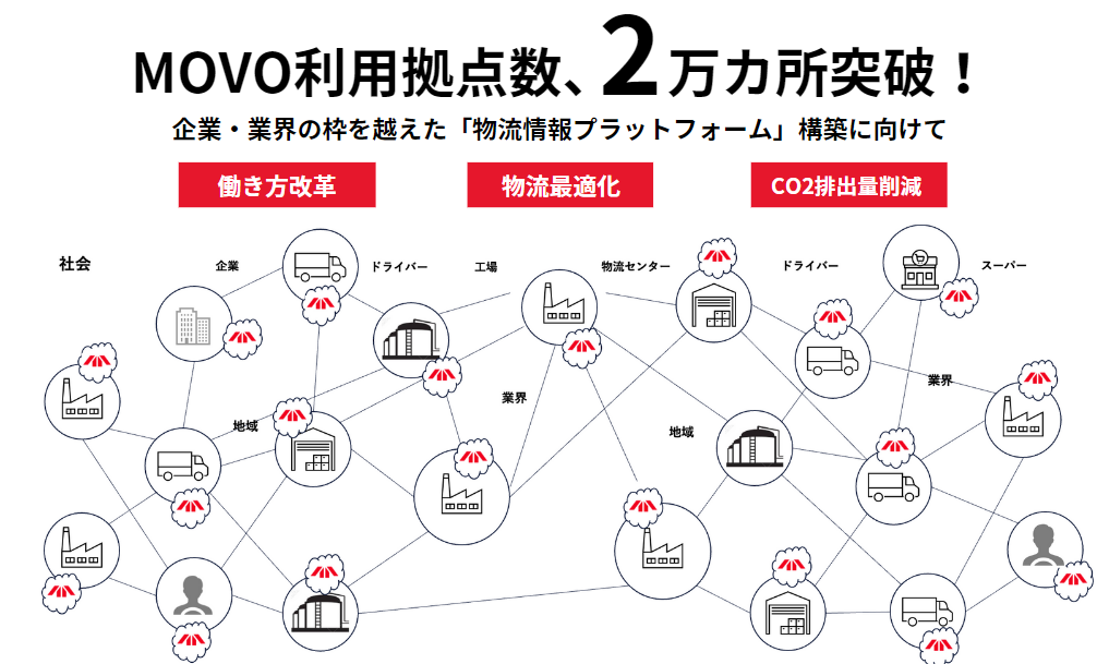 Hacobuは、物流DXパートナーとして、物流の課題を解決するアプリケーション「MOVO」や物流コンサルティングサービス「Hacobu Strategy」を通じて、企業間物流の最適化を支援します。将来的には、企業や業界の枠を越えた物流ビッグデータの蓄積・活用基盤として「物流情報プラットフォーム」を構築し、物流最適化およびCO2排出量削減を推進していきます。